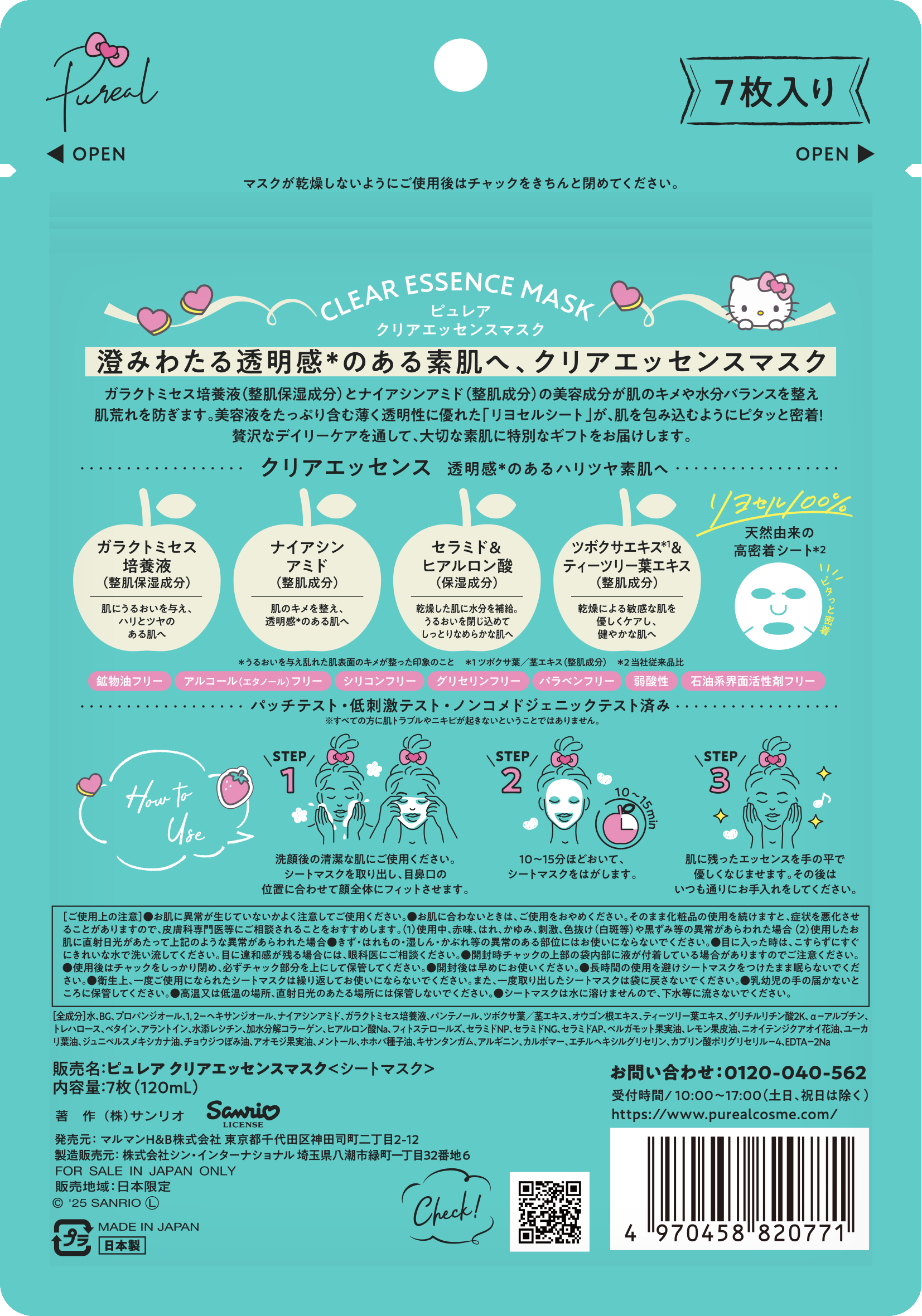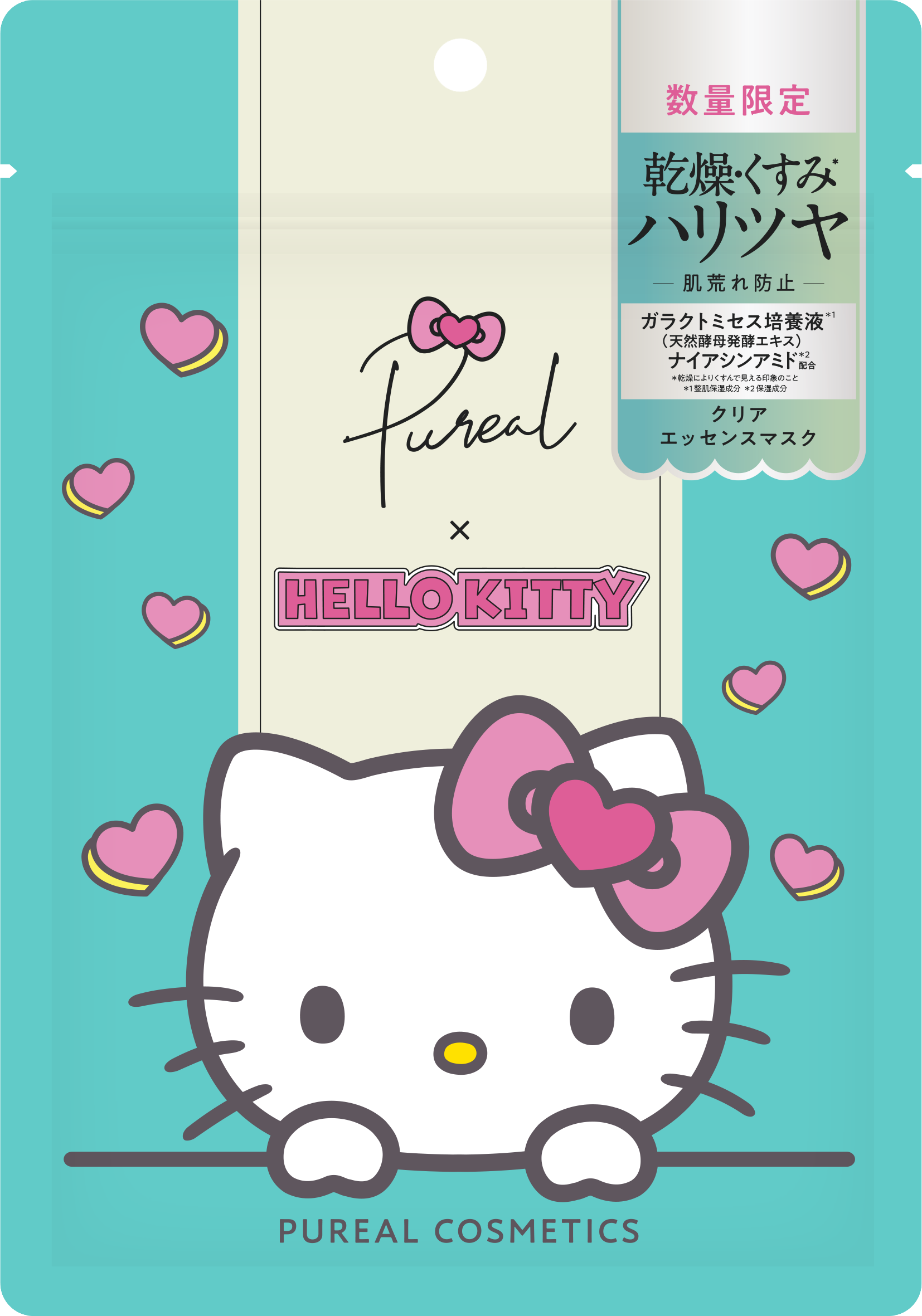 世界中で愛され続けている『ハローキティ』との夢のコラボレーションがついに実現。『ピュレア クリアエッセンスマスク』の高級感と清潔感を兼ね備えた鮮やかなカラーはそのままに、パッケージ前面にはこちらを覗くハローキティを配置。思わず手に取りたくなるような、可愛らしくも洗練されたデザインに仕上げました。毎日のスキンケアが特別な時間になるよう、ハローキティとともに贅沢なデイリーケアをお楽しみください。
