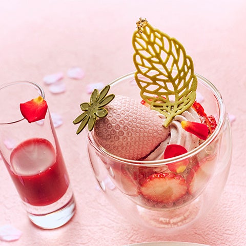 今回の一番のおすすめは、可愛いピンク色のいちごアイスをあしらった「苺パフェ」。「グラス(氷菓)を使ったアシエットデセール・コンテスト」優勝経験のあるパティシエ2名が試行錯誤し、生のいちごのフレッシュさを残しつつ、口どけなめらかな味わいに仕上げました。月替わりでご用意する別添えのソースで、味の変化をお楽しみいただけます。その他、真っ赤ないちごを模(かたど)ったホワイトチョコレートのムースが目をひく「苺ショコラ」や、いちごとチーズを組み合わせた「苺フロマージュ」、しっとりとした生地と生クリームに果肉入りのいちごソースが相性抜群の「苺ヴェリーヌ」など、味はもちろん見た目も楽しめるスイーツをご用意します。