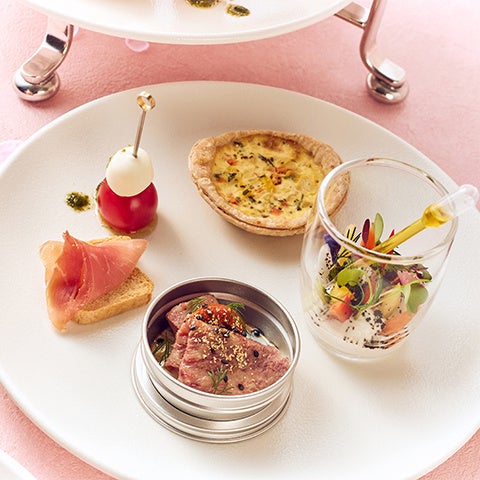 また、セイボリーにはフレンチシェフ考案の黒毛和牛を使用した冷製オードブルや、バーニャカウダ・キッシュなど、ミニサイズながらもこだわりの逸品を揃えました。ドリンクはロンネフェルト社製紅茶など24種類からお好きなものを2杯お選びいただけます。