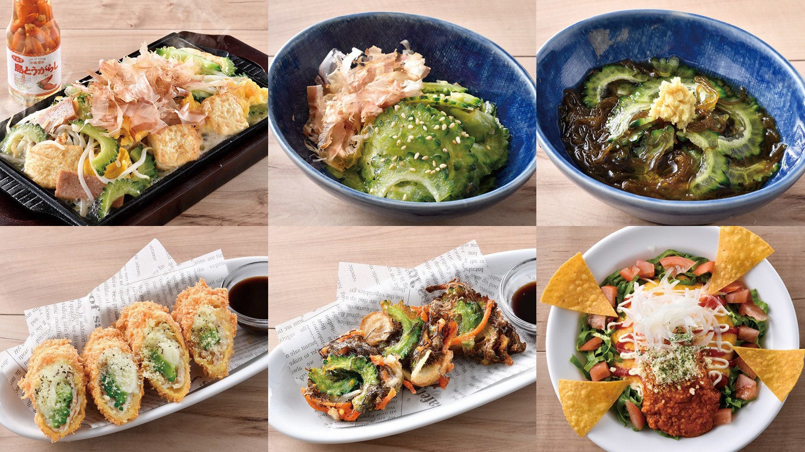 対象メニュー:ゴーヤチャンプルー 658円/ゴーヤスライスの梅おかか和え 328円/もずくとゴーヤのさっぱり酢の物 328円/ゴーヤの肉巻きチーズフライ 438円/もずくの天ぷら 438円/ふわ玉のせタコライス 658円