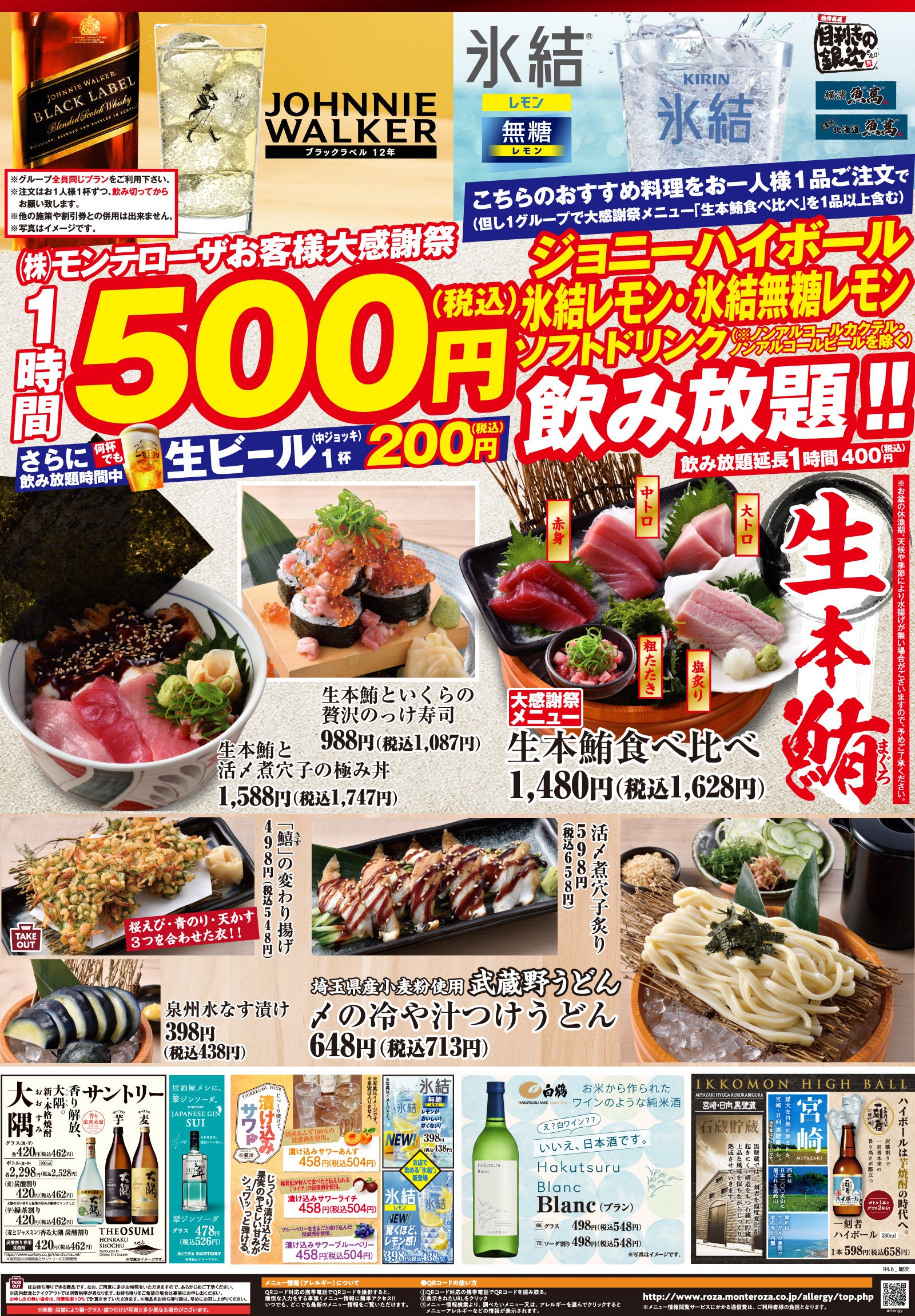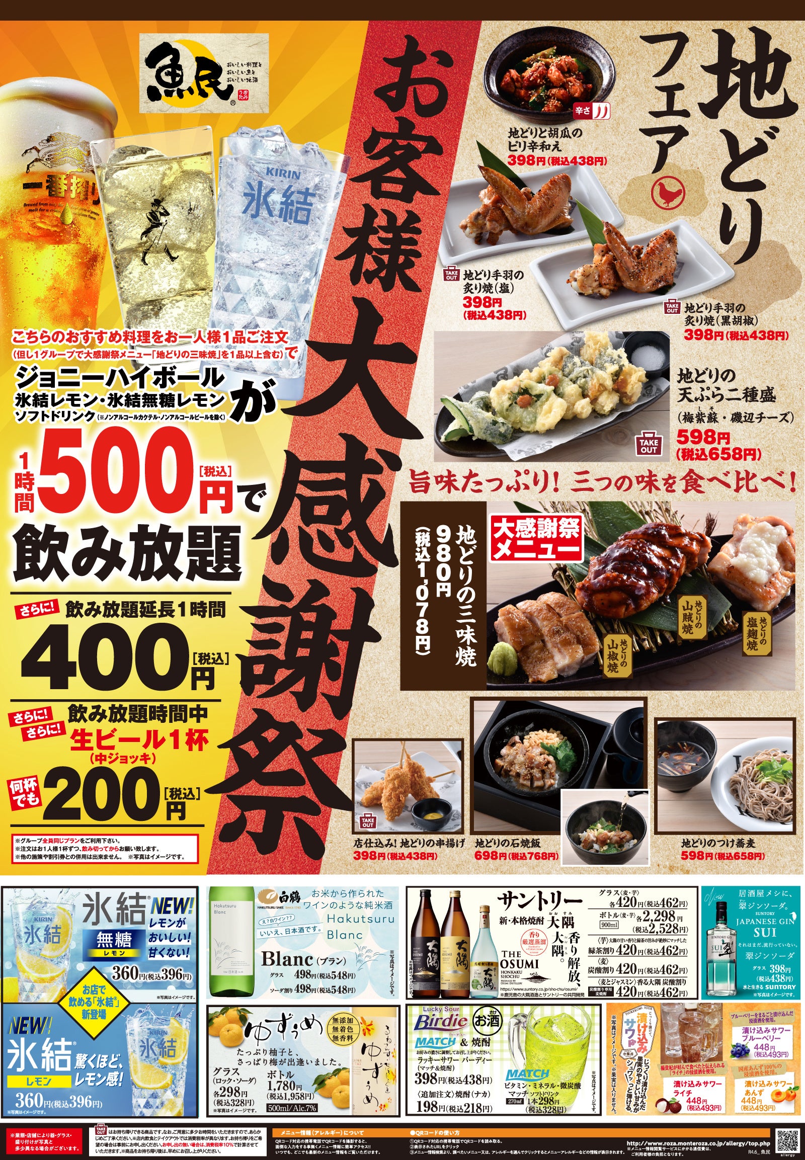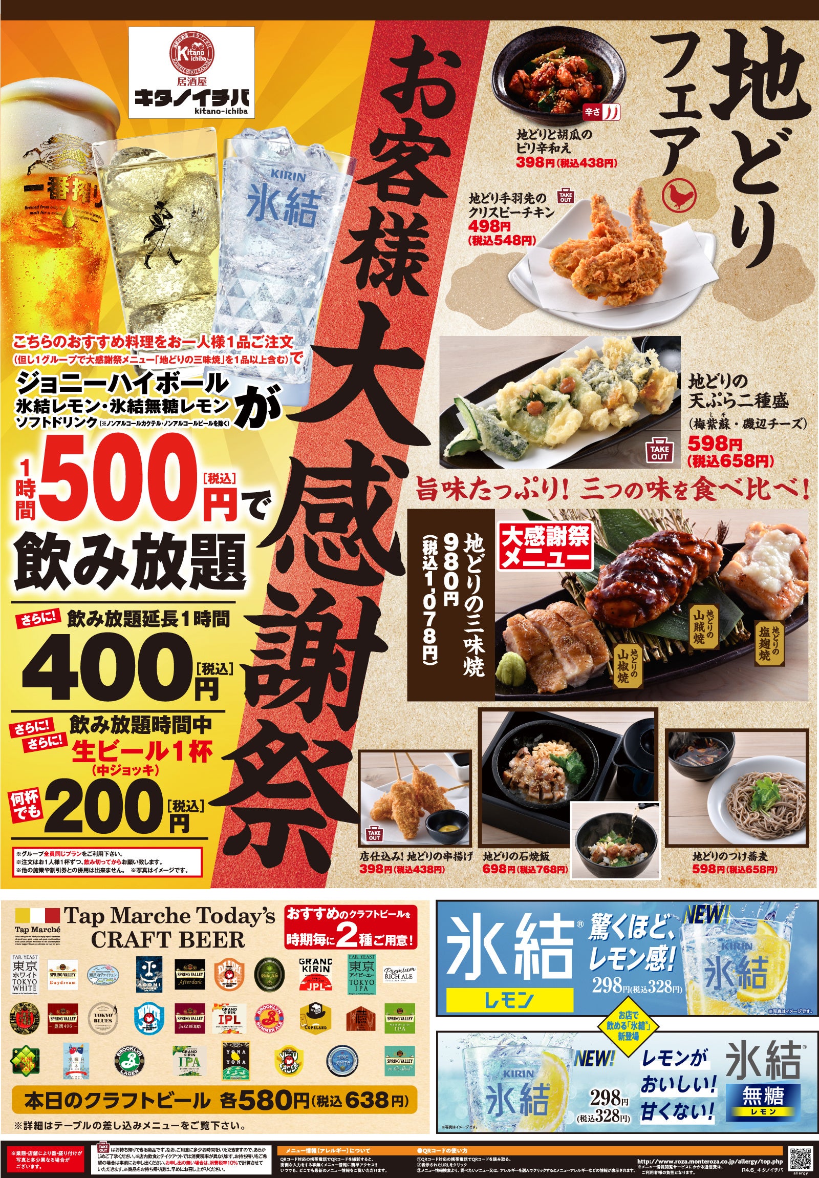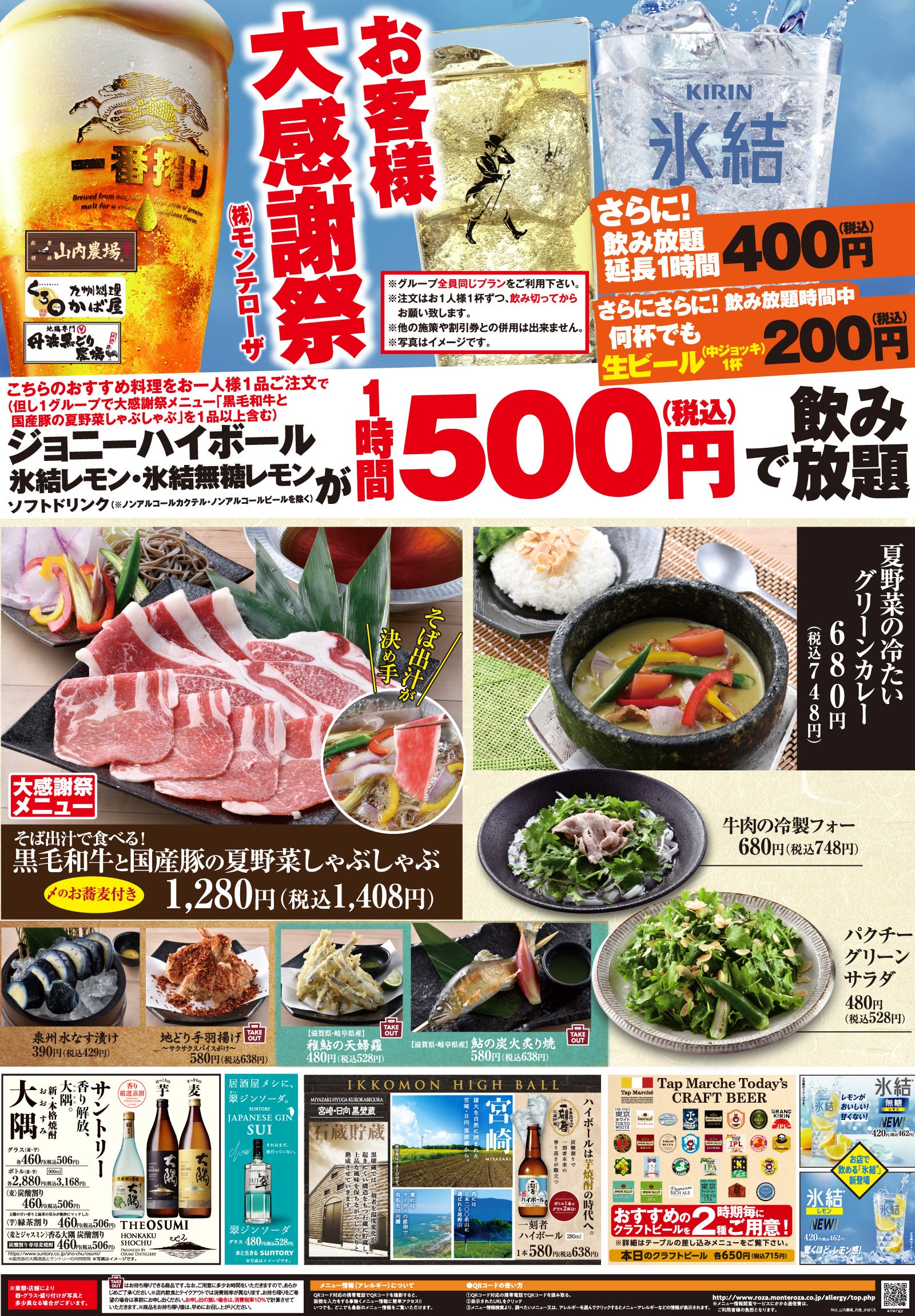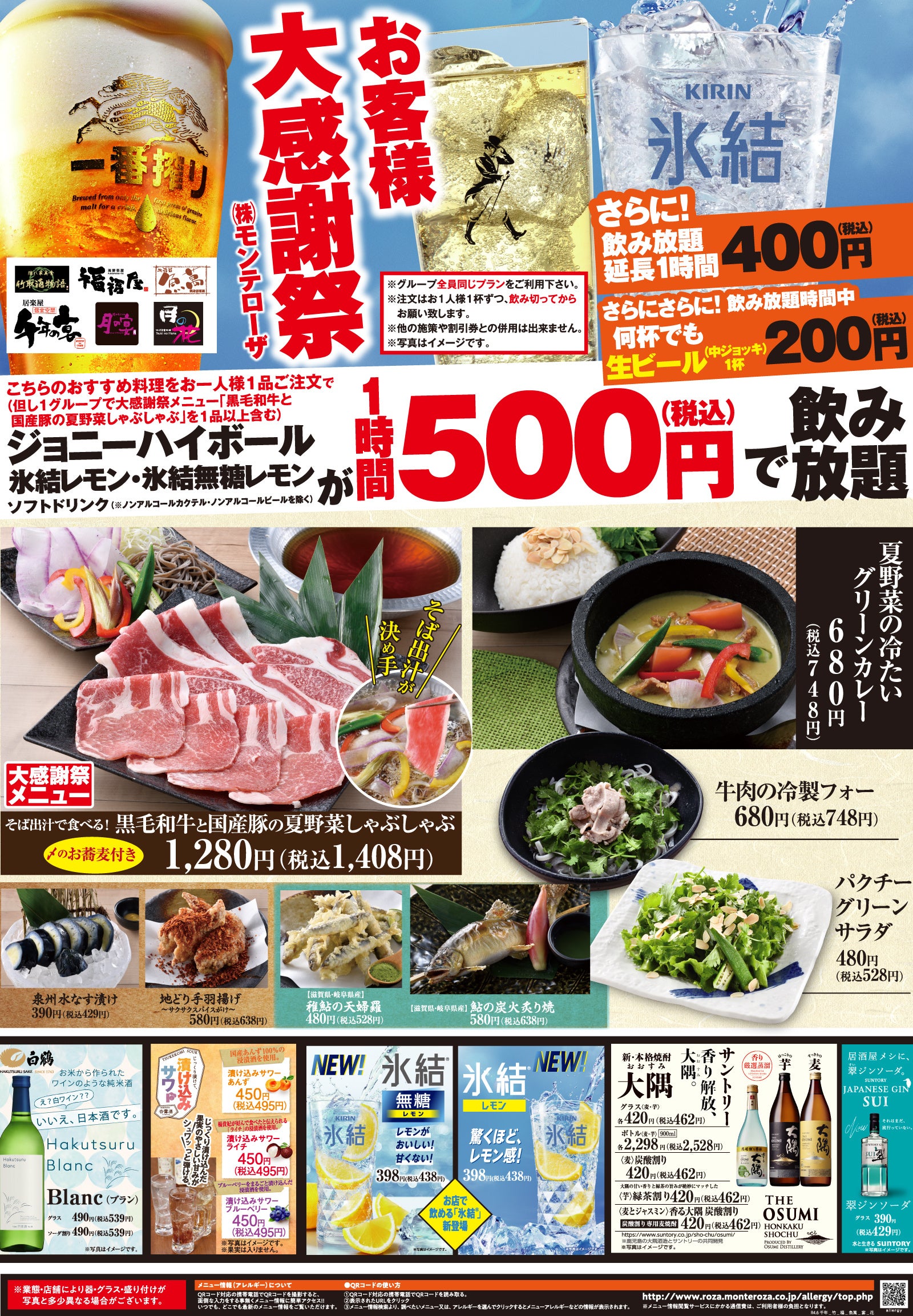 【夏の大感謝祭】ジョニーハイボールやキリン氷結レモンなど対象ドリンク限定で「お1人様1時間500円飲み放題」を実施中!