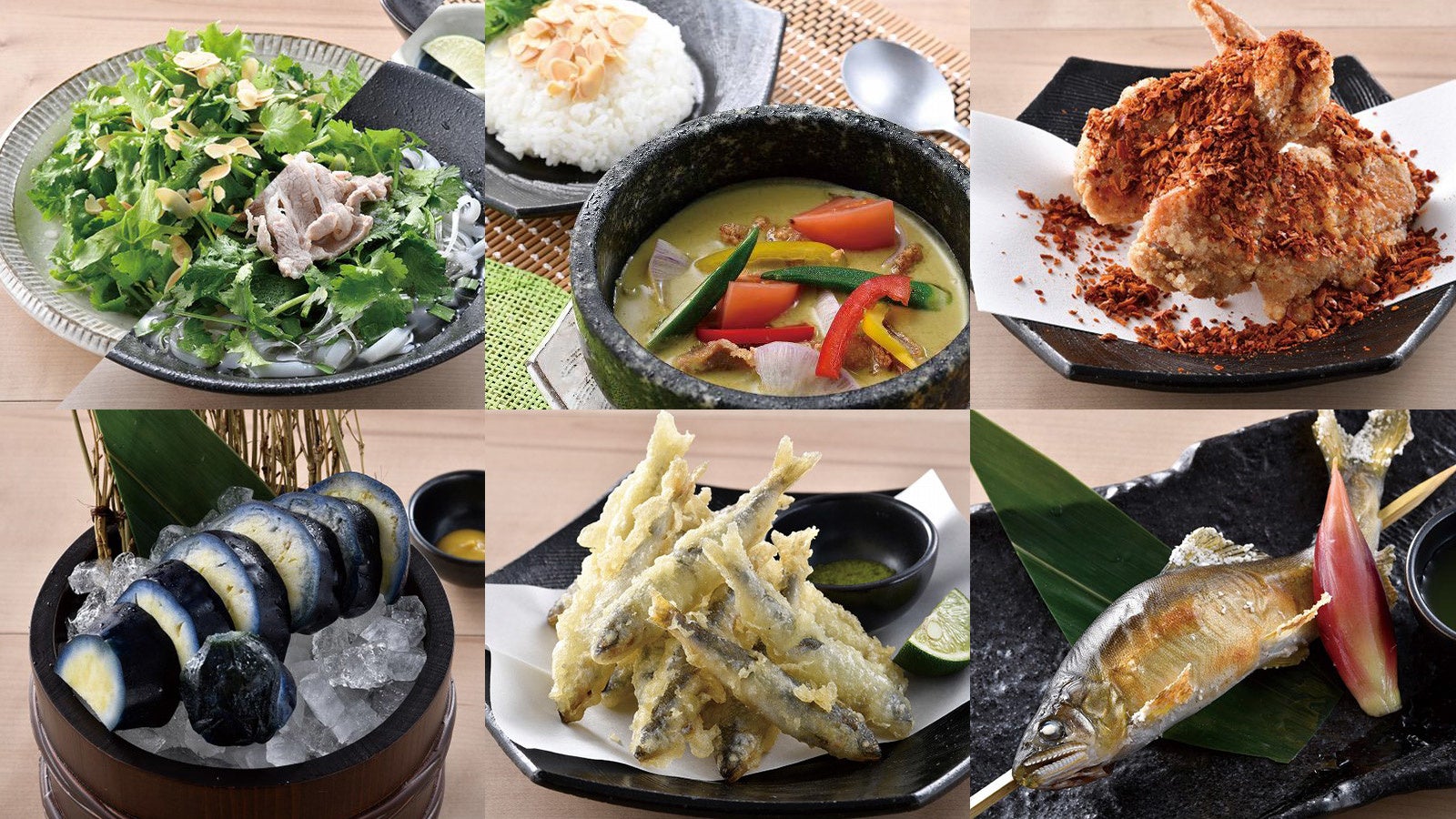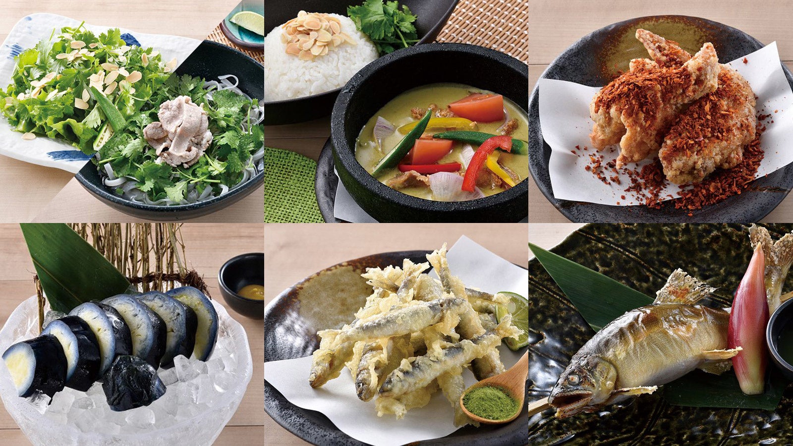 対象メニュー:パクチーグリーンサラダ 528円/牛肉の冷製フォー 748円/夏野菜の冷たいグリーンカレー 748円/地どり手羽揚げ~サクサクスパイスがけ~ 638円/泉州水なす漬け 429円/【滋賀県・岐阜県産】稚鮎の天婦羅 528円/【滋賀県・岐阜県産】鮎の炭火炙り焼 638円