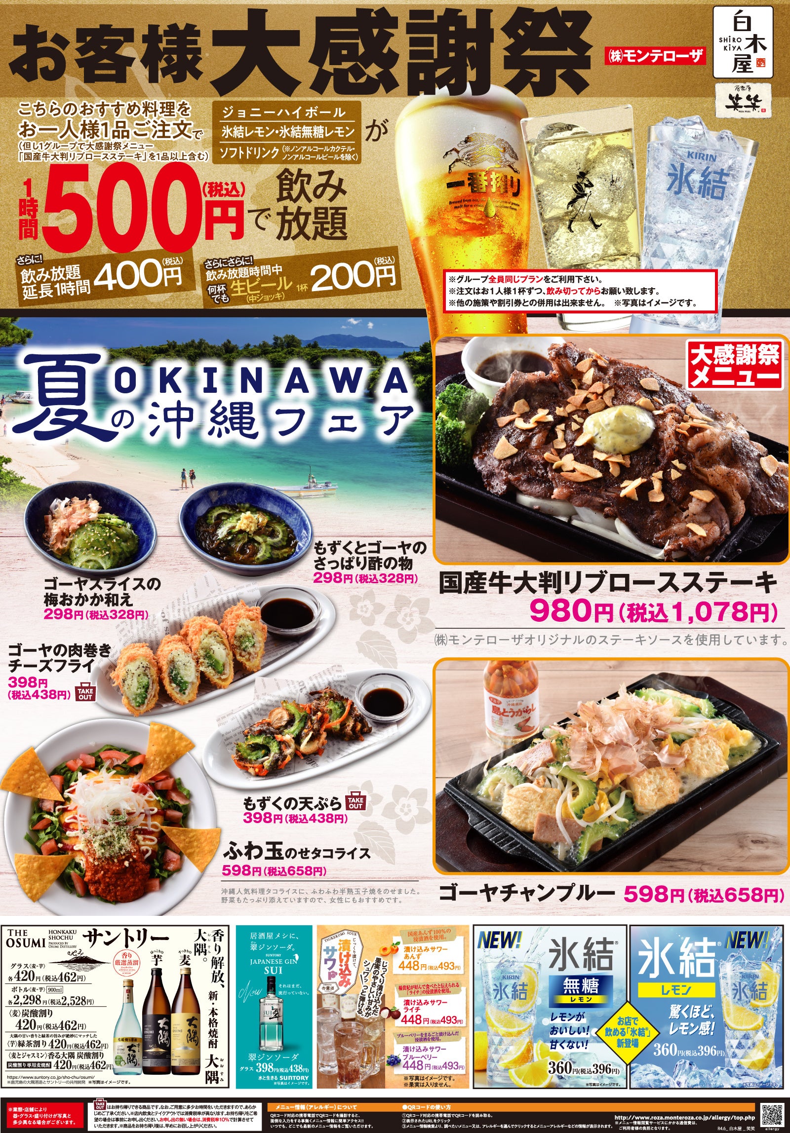 株式会社モンテローザ(本社:東京都武蔵野市、代表取締役:大神 輝博)は、2022年6月1日から2022年8月31日までの期間、全国の白木屋、魚民、目利きの銀次、千年の宴など約1,230店舗で「夏の大感謝祭キャンペーン」を開催します。本キャンペーンでは、夏の大感謝祭キャンペーンメニューまたは季節のおすすめメニューをお1人様1品以上ご注文いただくことを条件に、夏にピッタリの対象ドリンクを1時間500円で「限定飲み放題」として楽しめます。また、この「限定飲み放題」のご利用時間内に限り、生ビール(中ジョッキ)を何杯でも1杯200円で提供します。本リリース内の金額は、すべて税込価格表示です。