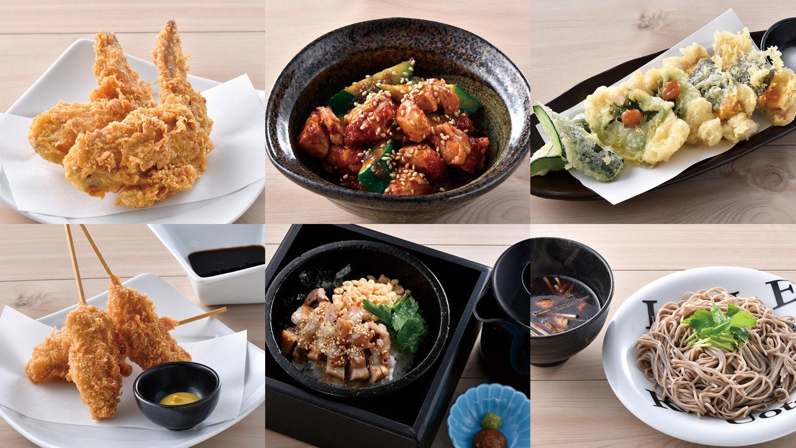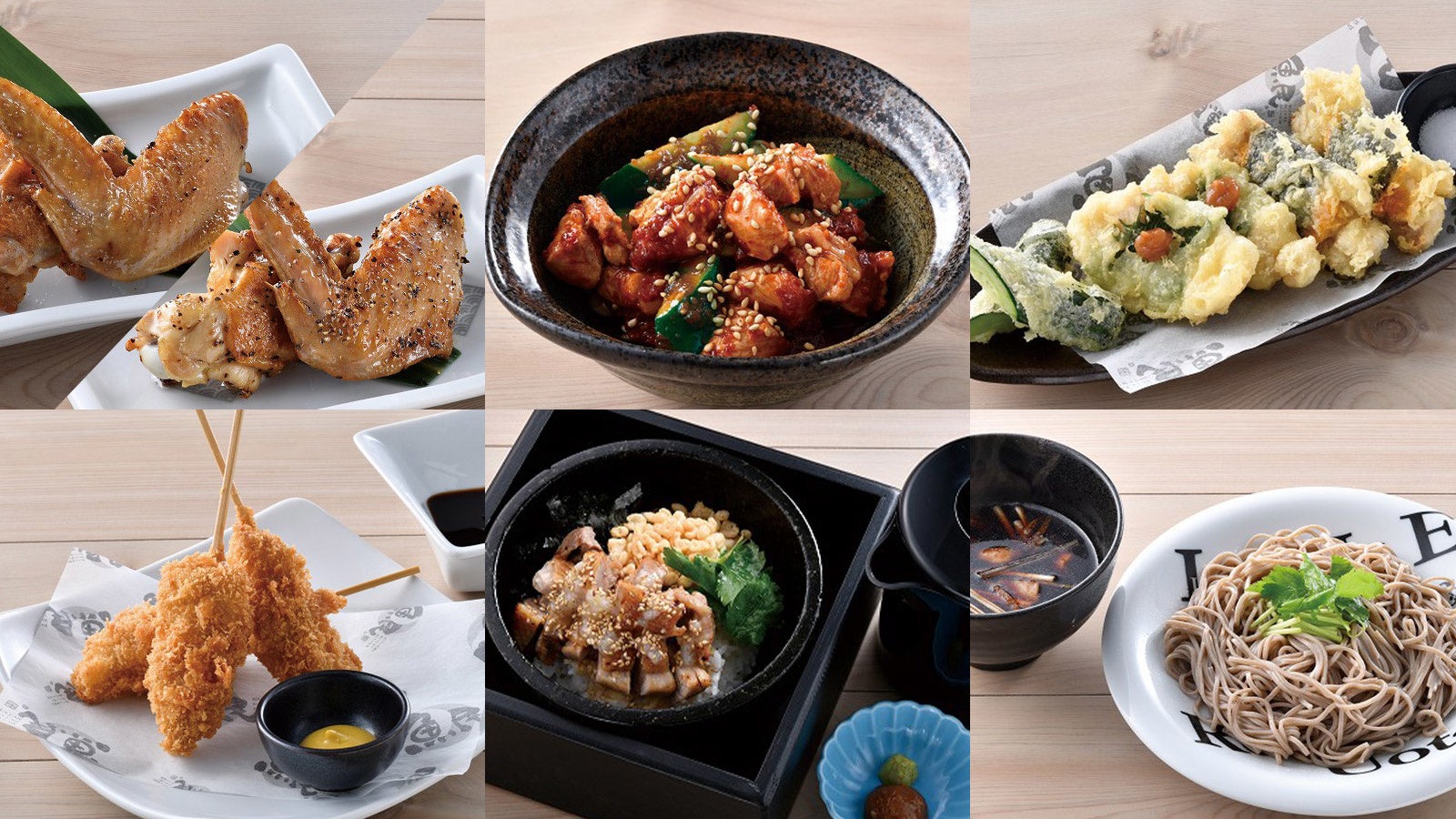 対象メニュー:地どり手羽先のクリスピーチキン 548円/地どりと胡瓜のピリ辛和え 438円/地どりの天ぷら二種盛(梅紫蘇(しそ)/磯辺チーズ) 658円/店仕込み!地どりの串揚げ 438円/地どりの石焼飯 768円/地どりのつけ蕎麦 658円