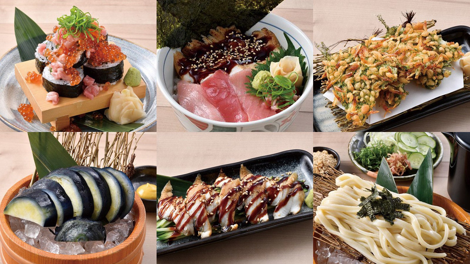 対象メニュー:生本鮪といくらの贅沢のっけ寿司 1,087円/生本鮪と活〆煮穴子の極み丼 1,747円/鱚(きす)の変わり揚げ 548円/泉州水なす漬け 438円/活〆煮穴子炙り 658円/【埼玉県産小麦粉使用 武蔵野うどん】〆の冷や汁つけうどん 713円