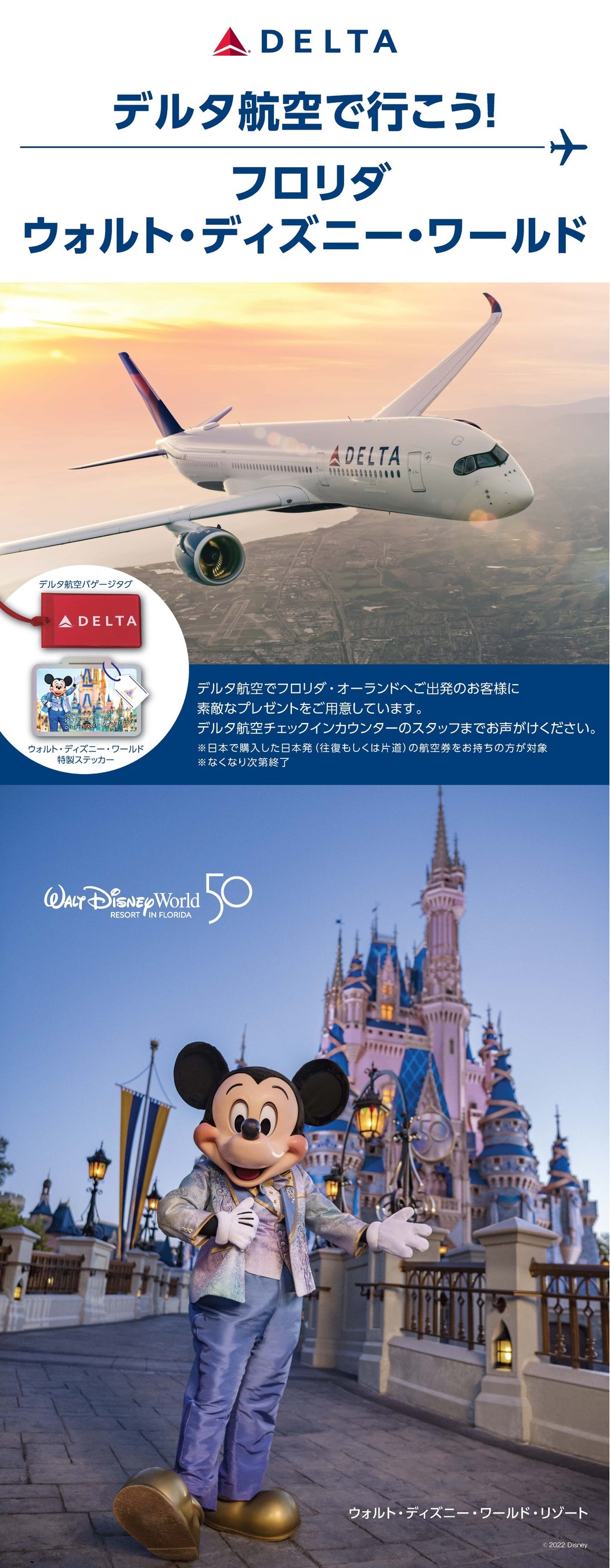 内 容:オーランド行き航空券をご購入のお客様にウォルト・ディズニー・ワールド・リゾート50周年特別デザインのステッカーとデルタ航空のロゴ入りバゲージタグをプレゼント
