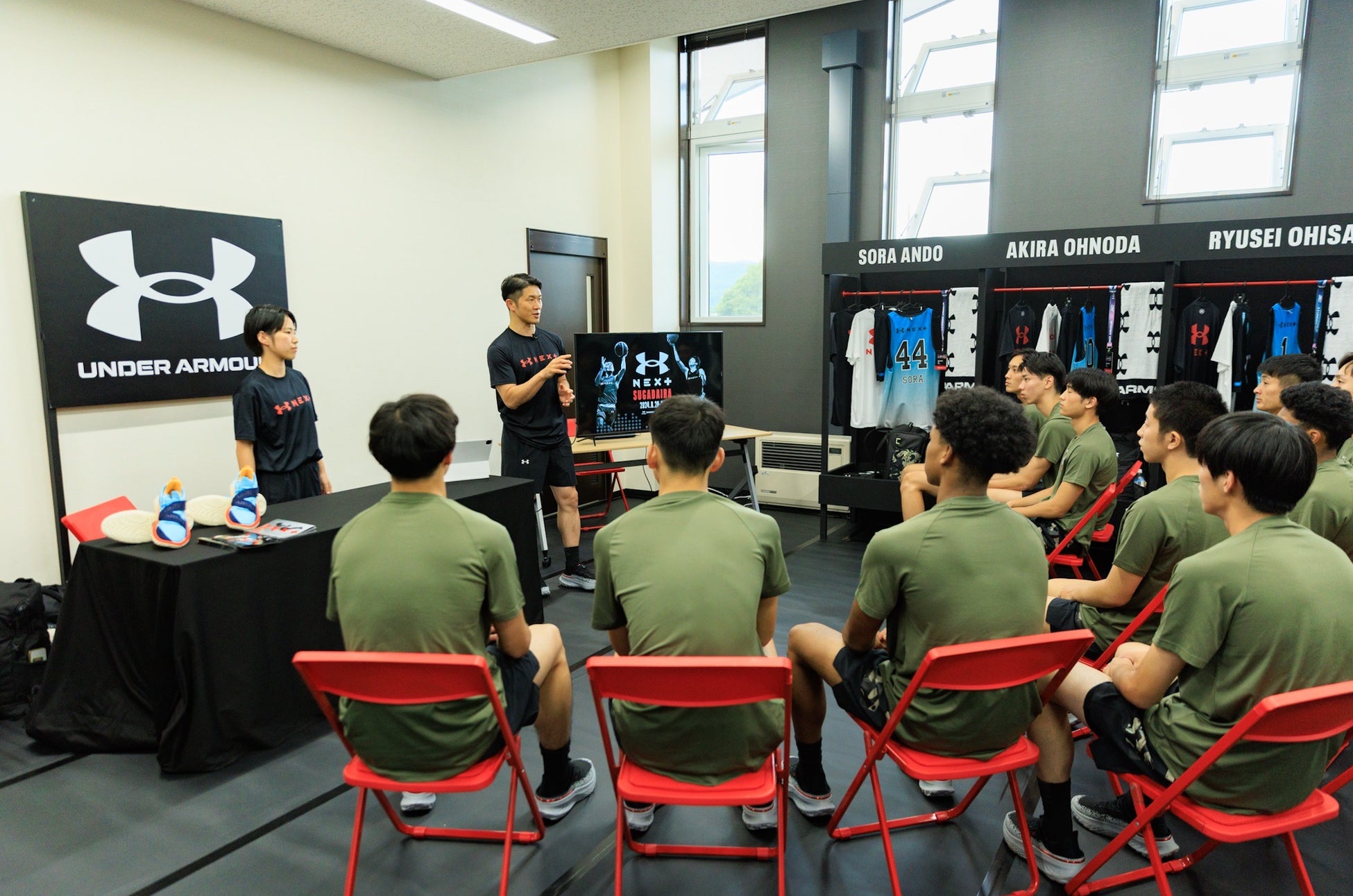 会場に到着するとまずは各選手へ今回のキャンプで着用するアンダーアーマーのウェアとシューズをお渡しし、続いて鈴木コーチから「勝利の原則」や3日間通しての目標といった概要をお話いただきました。