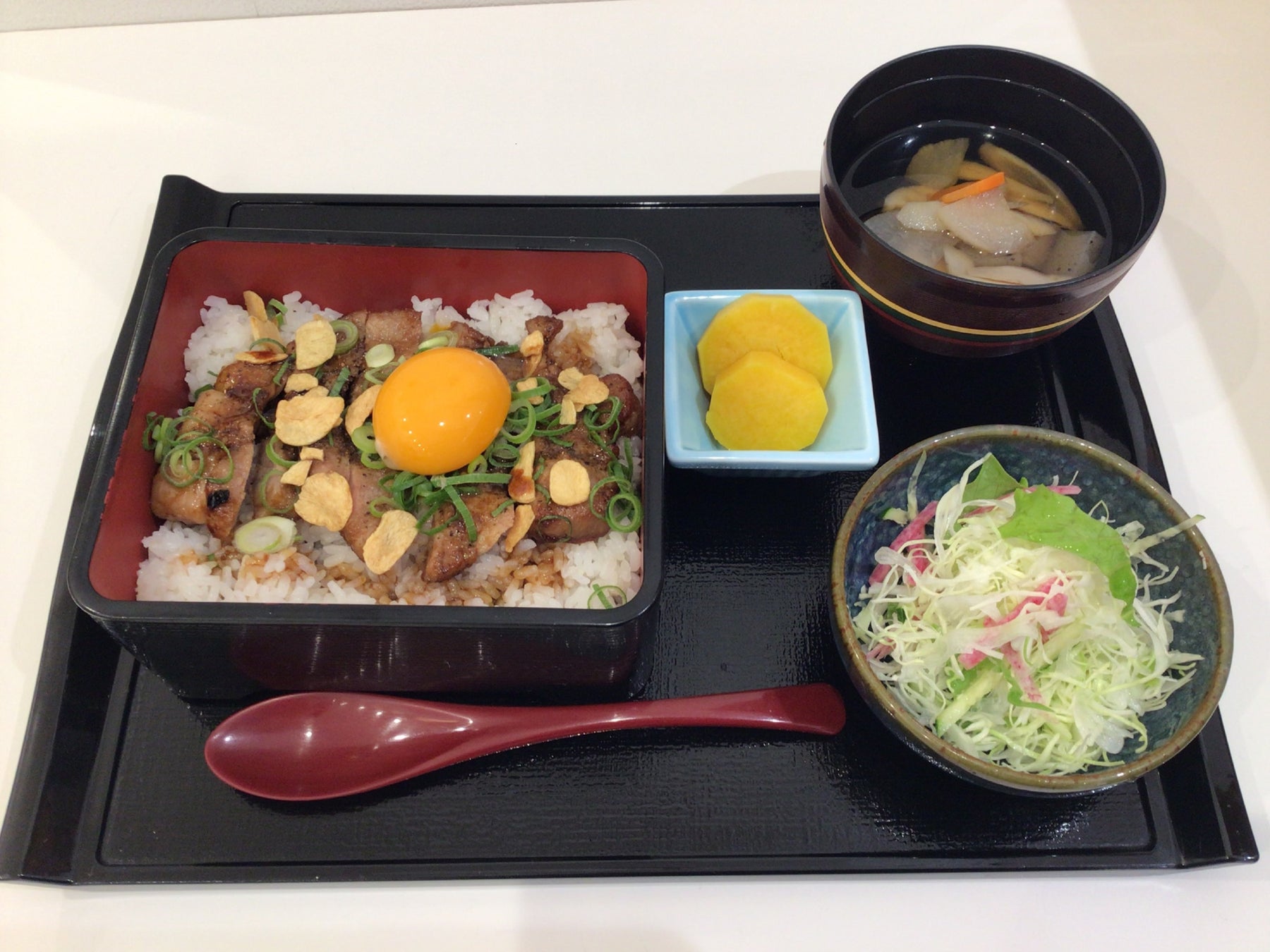ステーキにした「能登豚」に、ガリバタ風特製ソースをからめ、県内産コシヒカリの銀シャリの上にのせました。