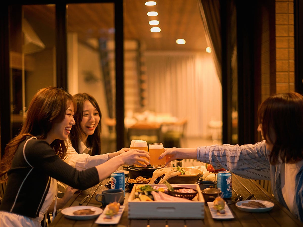 お食事は茨城県産の野菜やお肉、海鮮をはじめ思わず写真に撮りたくなるこだわりBBQコースをお愉しみいただけます。デザートのクレームブリュレは仕上げとしてご自身でバーナーを使い焼き目をつけることができるなど、自分たちで作り上げる楽しさも体験いただけます。