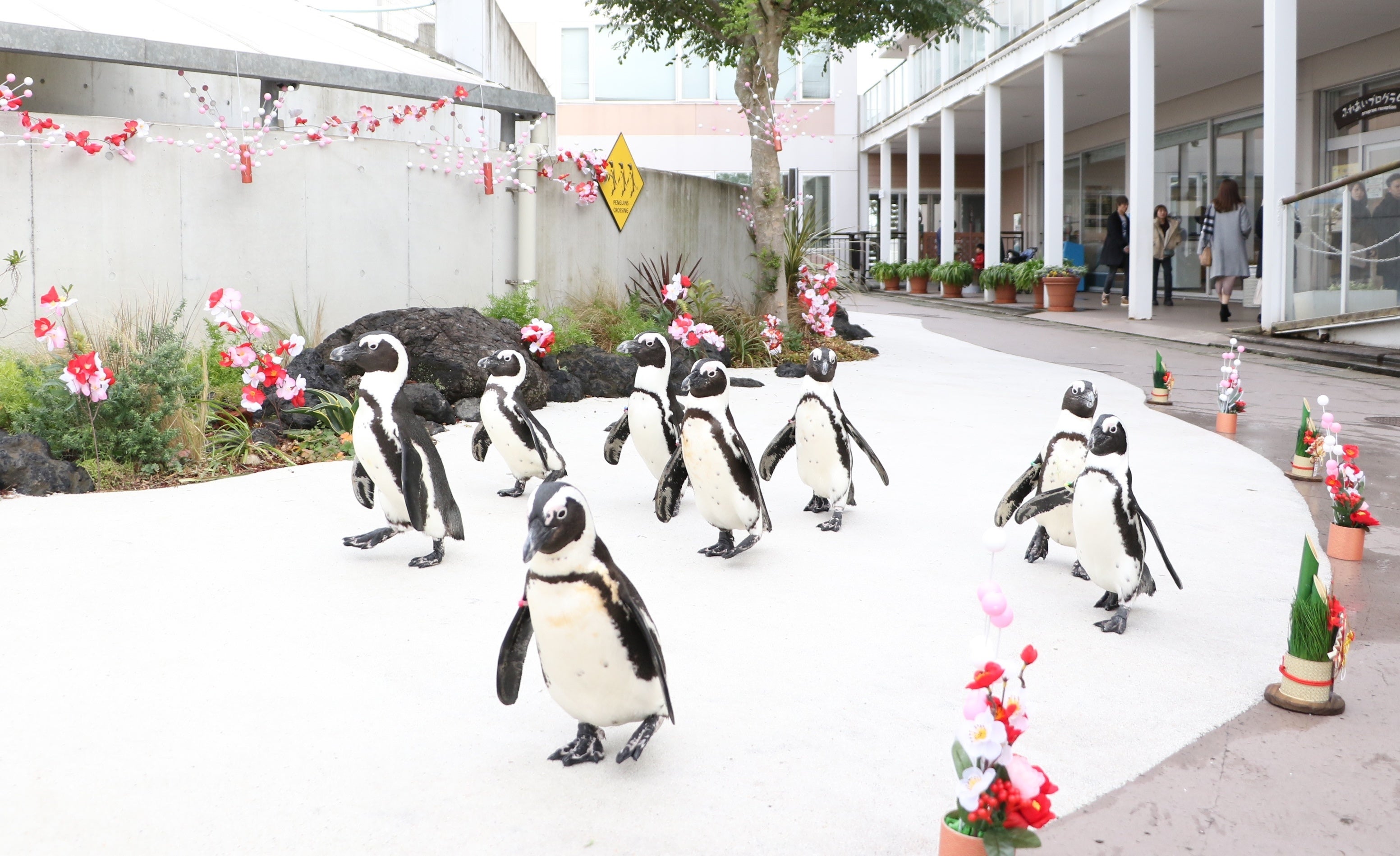 ぺたぺたよちよちと歩く姿が可愛らしいケープペンギンたちが、皆さまの前をパレードいたします。たくさんのペンギンたちが桜並木をゆっくりと歩く姿は、まるでお花見を 楽しんでいるかのよう。パレードの後は、ケープペンギンとの記念撮影やふれあいをお楽しみいただけます。