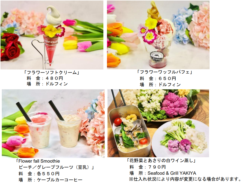 ストロベリーソースをトッピングしたワッフルとアイスを同時に楽しめる「フラワーワッフルパフェ」や、菜の花やスティックセニョールといった花野菜を使った春を感じる「花野菜とあさりの白ワイン蒸し」など、視覚だけでなく味覚でもお花見シーズンを盛りあげます。