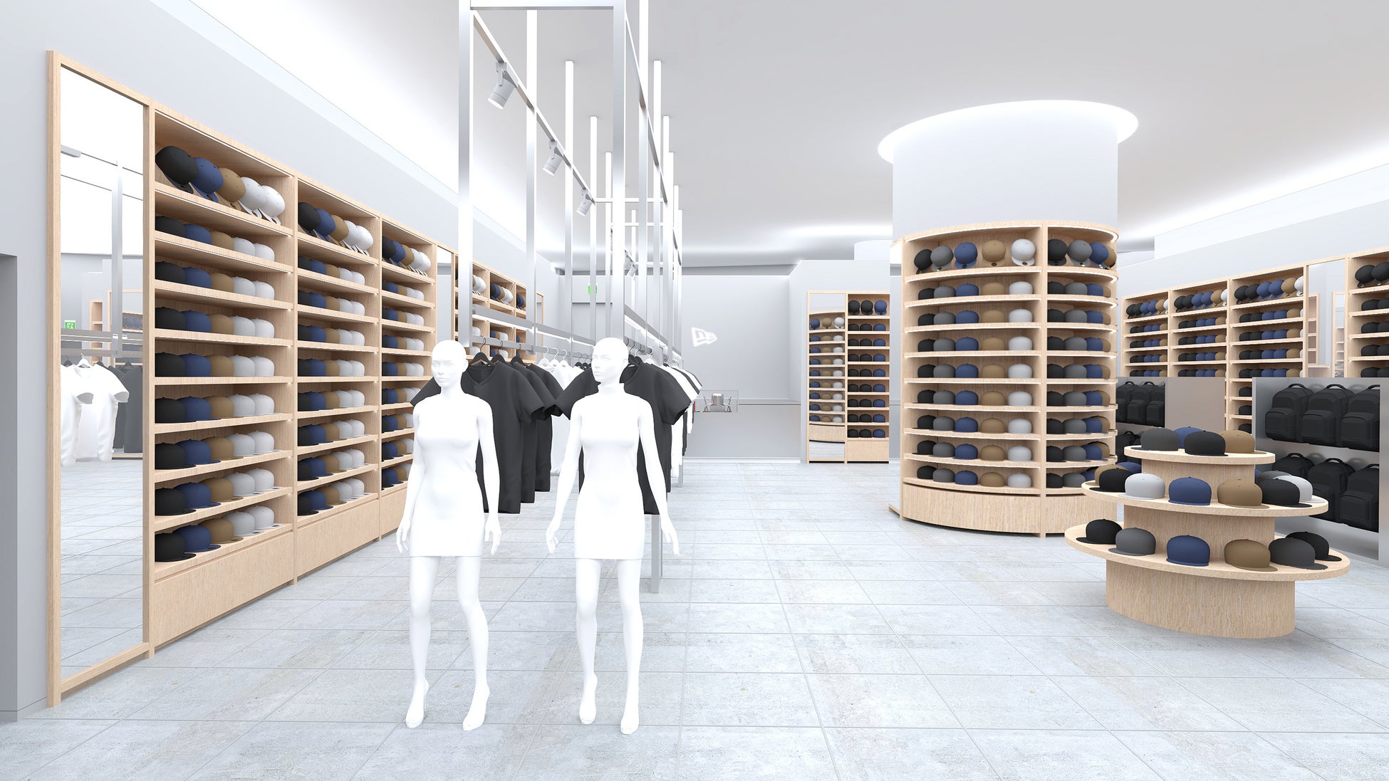 ニューエラ豊洲は、ショッピングモールの開放的な環境に寄り添いながら、ブランドの世界観を丁寧に織り込んだストアデザインを採用。木目調の棚とスチール什器を随所に配した店内は、明るく洗練された印象に仕上げています。中央には視認性の高い円柱型の棚を設け、連動したデザインの三段陳列棚とともに、最新コレクションやシーズンアイテムを展開します。