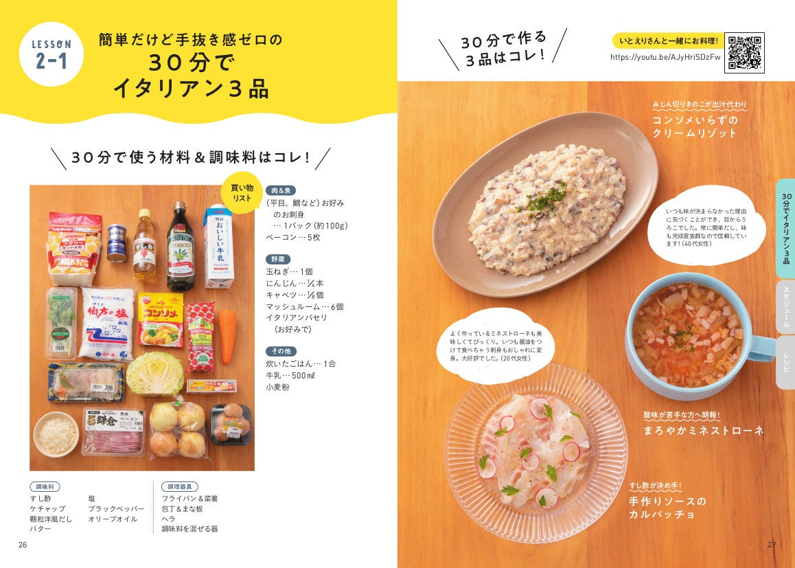 本書はフライパンひとつで30分で3品、1時間で5品の料理ができるように構成されています。これまでオンライン教室で扱ってきた500以上のレシピの中から62品を厳選して収録! タイムスケジュールや時短テク・おすすめ調味料など盛りだくさんの内容に。しかもすべてのレシピにはレッスン動画がついているので、わかりやすく調理ができます。さらに、レッスンで大好評の「時短おつまみごはん」のコラムもあり、ちょっと一杯にもイケる一品も作れます。お料理版ブートキャンプとも言える一冊、ぜひいとえりさんと一緒に料理を楽しみましょう!