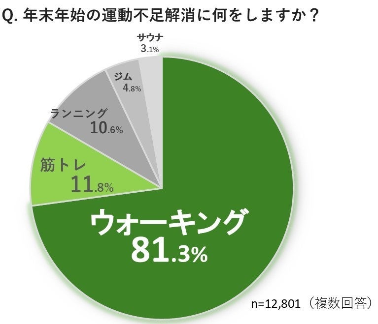 「年末年始の運動不足解消に何をしますか?」と聞いたところ、81.3%が「ウォーキング」と回答し、「ランニング」や「筋トレ」の回答数をはるかに上回る結果となりました。