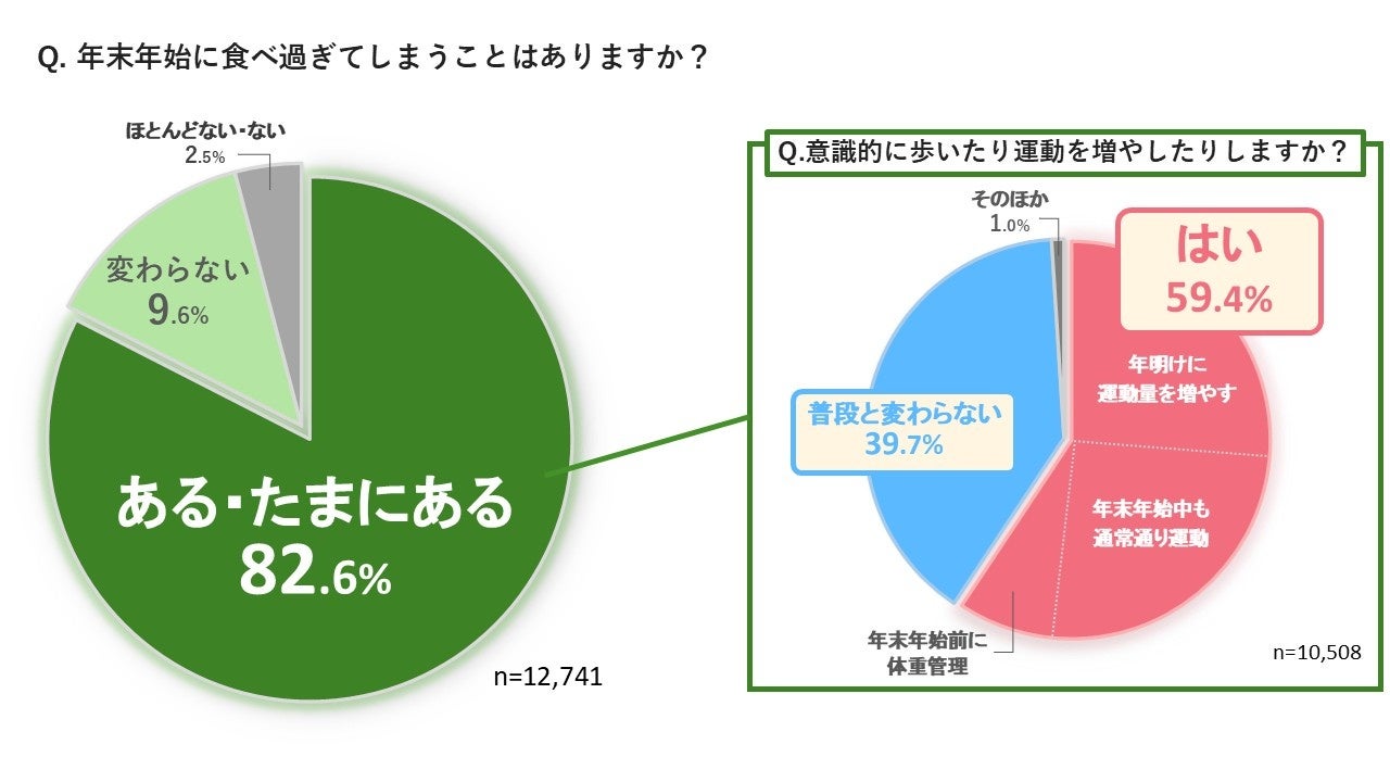 「年末年始に食べ過ぎてしまうことはありますか?」という質問では、「ある」「たまにある」と回答した人が82.6%に上りました。そのうち、「年末年始を迎える前に運動量を増やして体重管理をしておく」「年末年始を楽しんだ後に運動量を増やす」「年末年始中も普段通りの運動をする」など、意識的に運動するという人は59.4%でした。