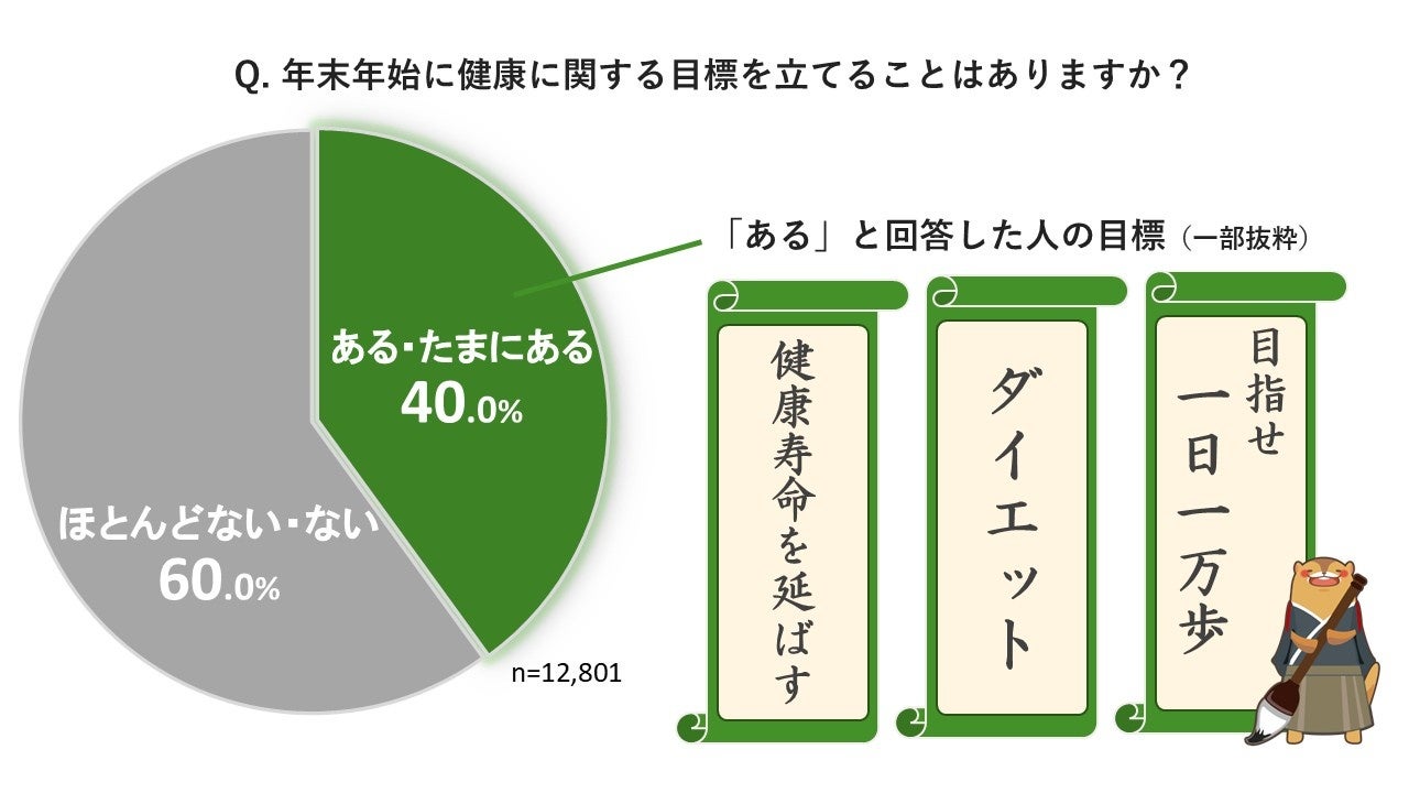 年末年始に健康に関する目標を立てる人は4割と控えめな結果。「健康第一」「ダイエット」の声が多数