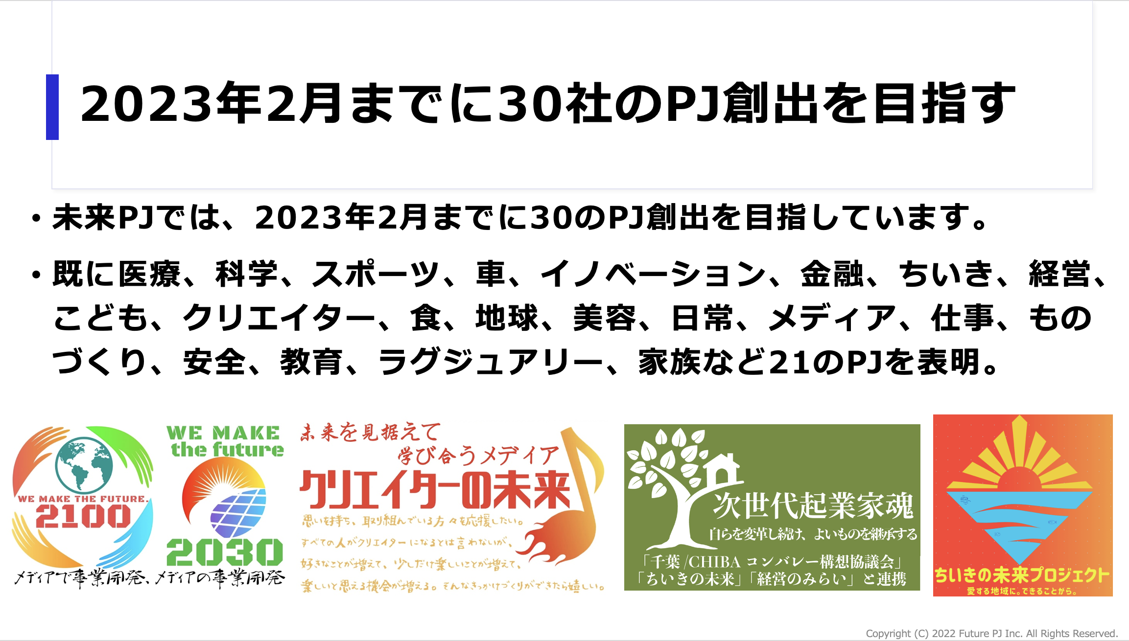未来PJでは、2023年2月までに30のPJ創出を目指しています。既に医療、科学、スポーツ、車、イノベーション、金融、ちいき、経営、こども、クリエイター、食、地球、美容、日常、メディア、仕事、ものづくり、安全、教育、ラグジュアリー、家族など21のPJを表明しています。