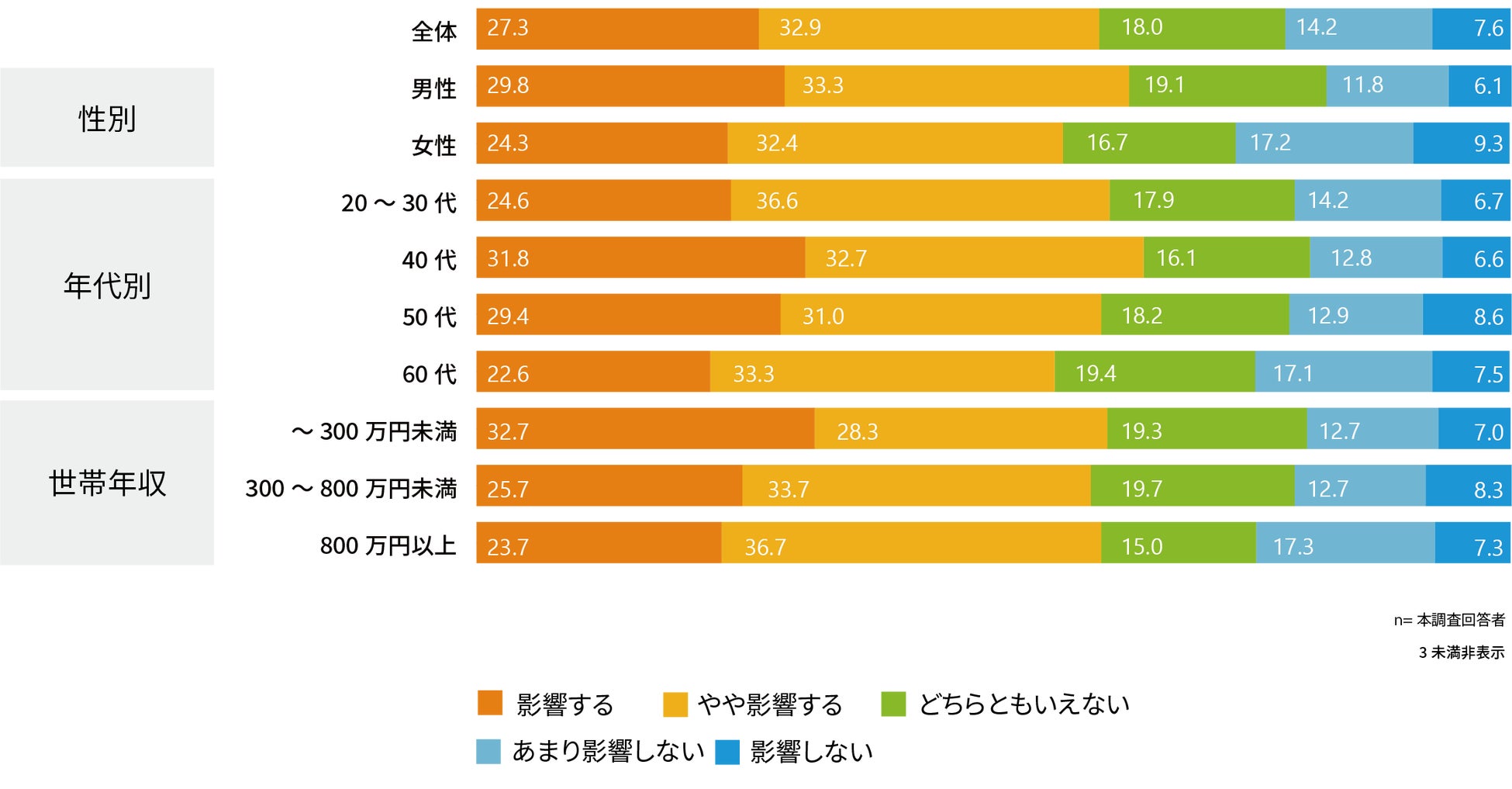 割引シールの購入有無に関する意識自体は世帯年収に差はないが、割引シールが来店にきっかけになるかで見ると、世帯年収が低い人のほうが、「影響する」と回答している。