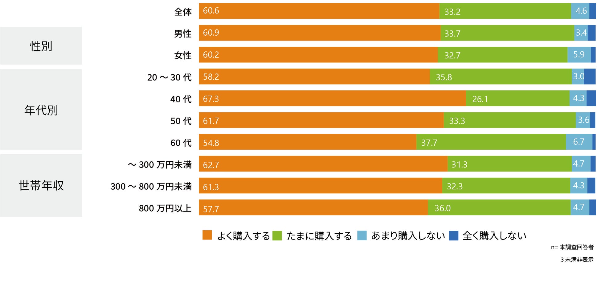 どの世帯年収でも約9割以上が「よく購入する」「たまに購入する」と回答し、一定数の人が「あまり購入しない」「全く購入しない」と回答している。
