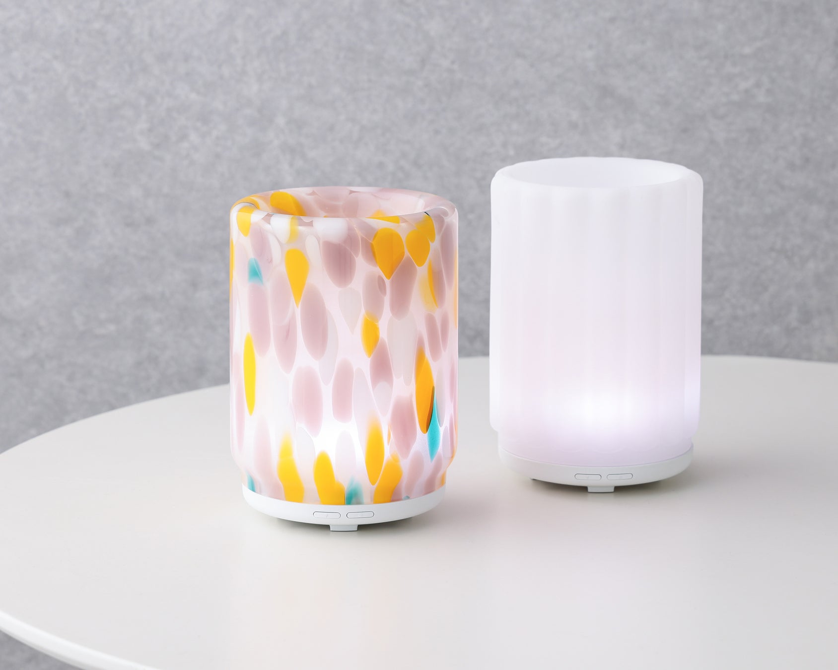 使いやすいダイヤル式で、噴霧量が簡単に調節できるのがポイント。コンパクトながらパワフルな加湿量で、お家の様々な場所で活躍します。アロマの香りを楽しめて、スペースを取らず、操作も容易なため、初めての加湿器としてもおすすめのアイテムです。どんな空間にも馴染むマーブルデザインに加え、お部屋のアクセントになる新色・グラデーションイエローの2色展開で、インテリアに合わせたコーディネートをお楽しみいただけます。
