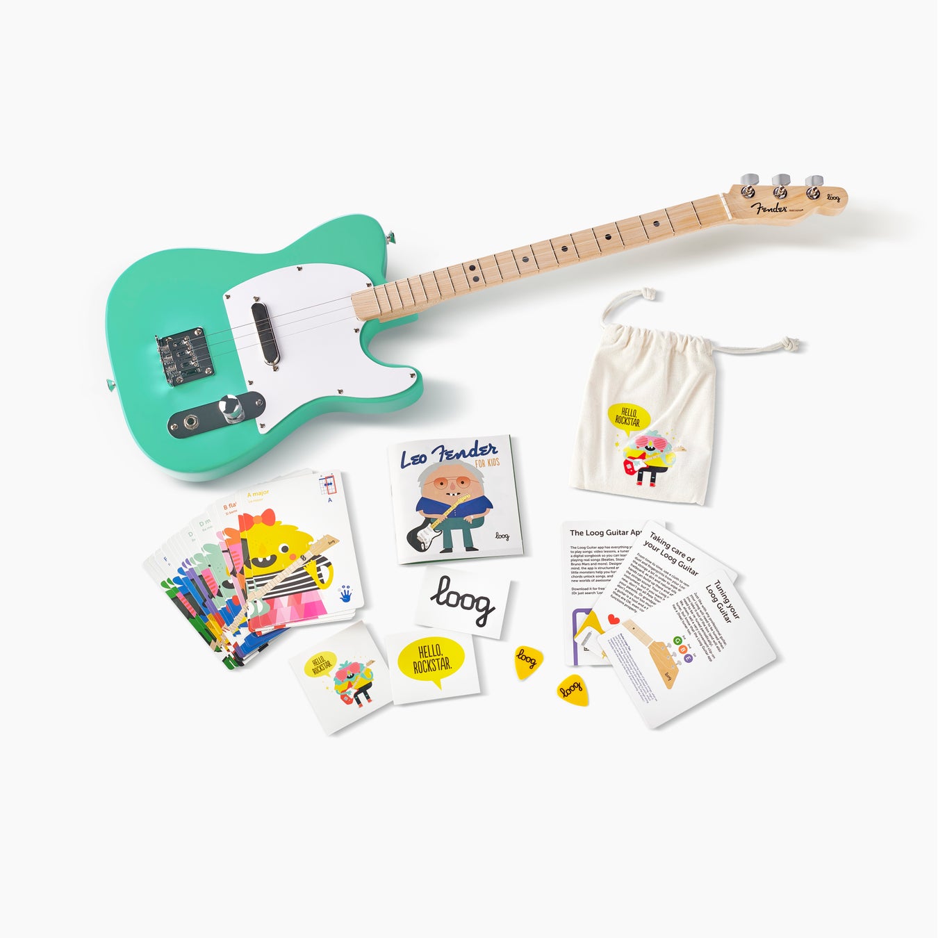 両社の製品チームが共同開発したこのギターには、ピックやコードフラッシュカード等、ギターを始める際に必要なツールから、今回のコラボレーションの為に特別に作られたフェンダーのエレキギターの歴史を紹介する小冊子が付属されています。また、Loogの学習アプリ『Loog Guitar』のダウンロードコードも同封されています。このアプリは、ビデオレッスンやゲーム感覚の練習などを提供し、お子様でも楽しみながらギターを学ぶことができます。(本アプリは、Apple及びGoogle Playにて無料でダウンロードいただけます。)※付属品及びアプリは、英語表記となります。