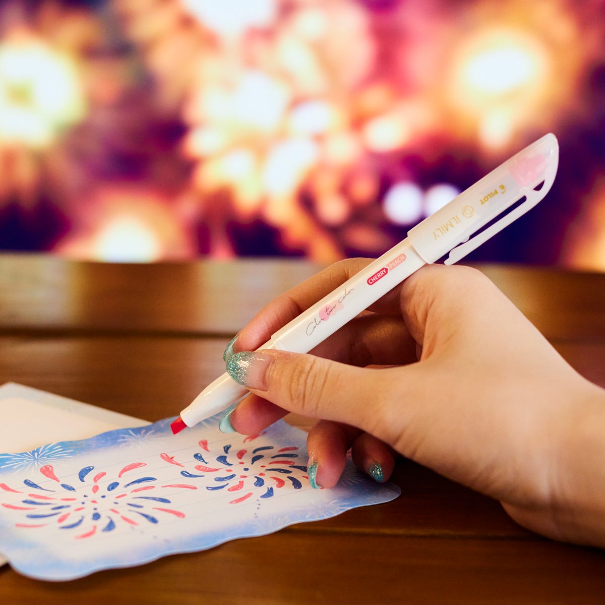 PILOT ILMILYの「Color two color(カラートゥーカラー)」は、こすると色が変わるマーカーです。塗った面を指先でなぞると、美しいグラデーションが浮かび上がり、まるで夜空に広がる花火のような演出が楽しめます。1本で、書く・塗るなど、さまざまな使い方ができる遊び心あふれるアイテムです。