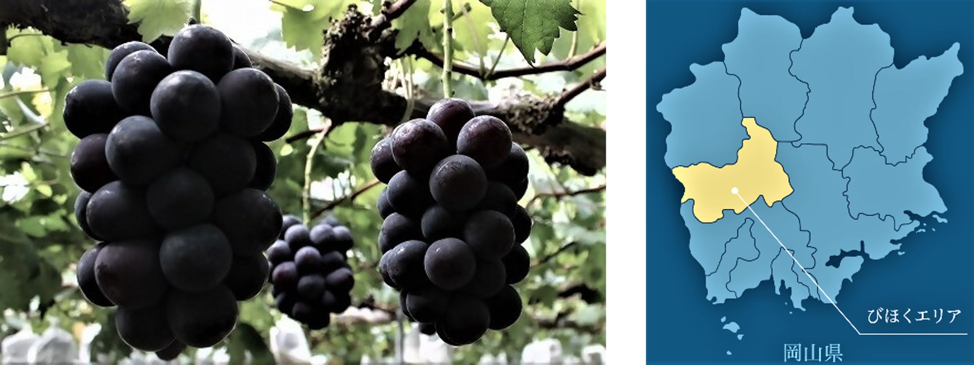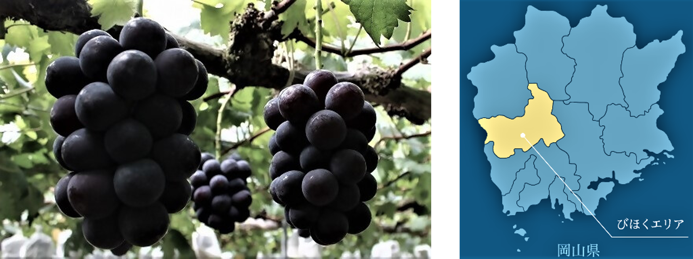 なかでも、岡山県高梁(たかはし)市を中心とした「びほくエリア」は、県内最大のピオーネの産地であり、びほく産のピオーネは、他にない美しい房型と大粒の濃い黒紫色、強い甘みが特長です。今回はびほく産ピオーネの中でも特に高品質なピオーネ「美王🄬」について、詳しくご紹介します。