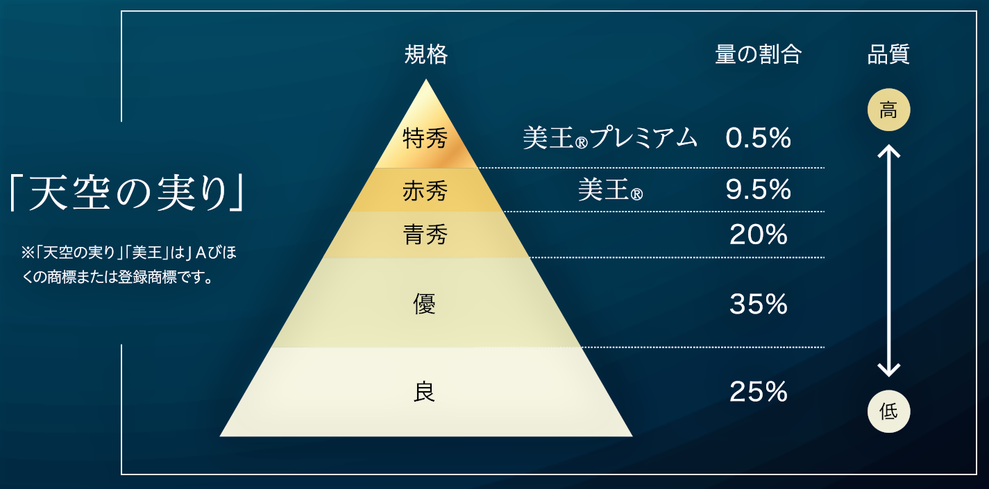 「美王🄬」として認められるのは、毎年生産される160万房以上のびほく産ピオーネのうち、約10%(最上位規格「美王🄬プレミアム」を含む)のみ。厳しい出荷規格をクリアした、まさに「黒紫の至宝」です。