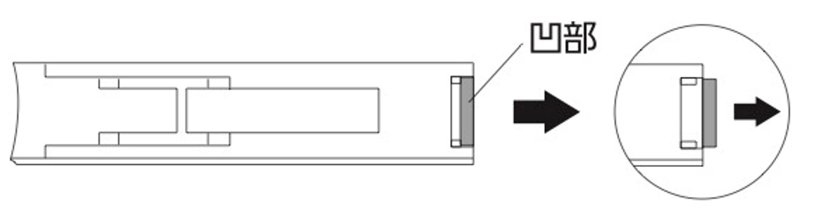 ①本体の裏側にある凹部に指(爪)をかけて矢印方向にスライドさせロックを解除します。