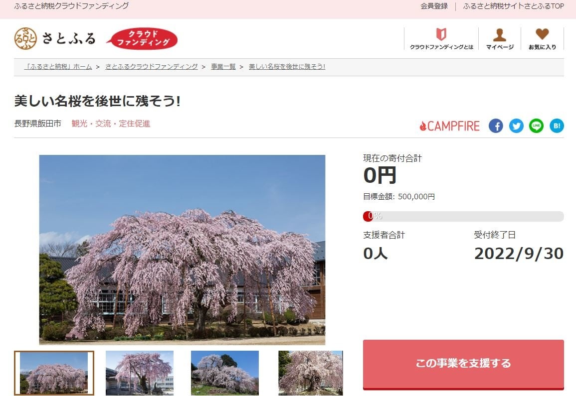 長野県飯田市とさとふる、樹齢300年を超える古桜・名桜を後世に残すため、寄付受け付けを開始