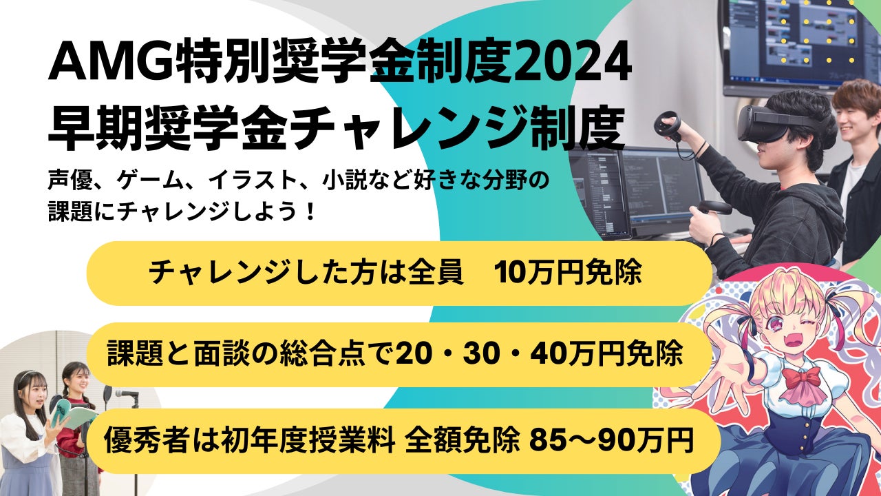 AMG特別奨学金制度(昼間部全学科 2024年4月入学対象)とは、日本のエンタテインメント産業の発展に貢献できる人材育成を目的とし、意欲的で優秀な学生に対し奨学金を付与する返済不要の奨学金制度です。