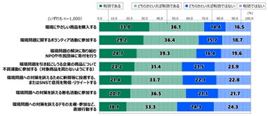環境に配慮して普段行っている取り組みでも、「食べ物を残さないようにする/外食の際は店が許せば食べ残した食事を持ち帰る」を筆頭に「誰もいない部屋の消灯」や「買い物の際のマイバック持参」、「ごみの分別」がいずれも4割を超え、食べ物やファッションなどの購入では約6割が「価格が高くなっても環境問題の解決につながる商品・サービスを選ぶ」と答えるなど、環境問題に前向きな若者の姿が数字に表れています。