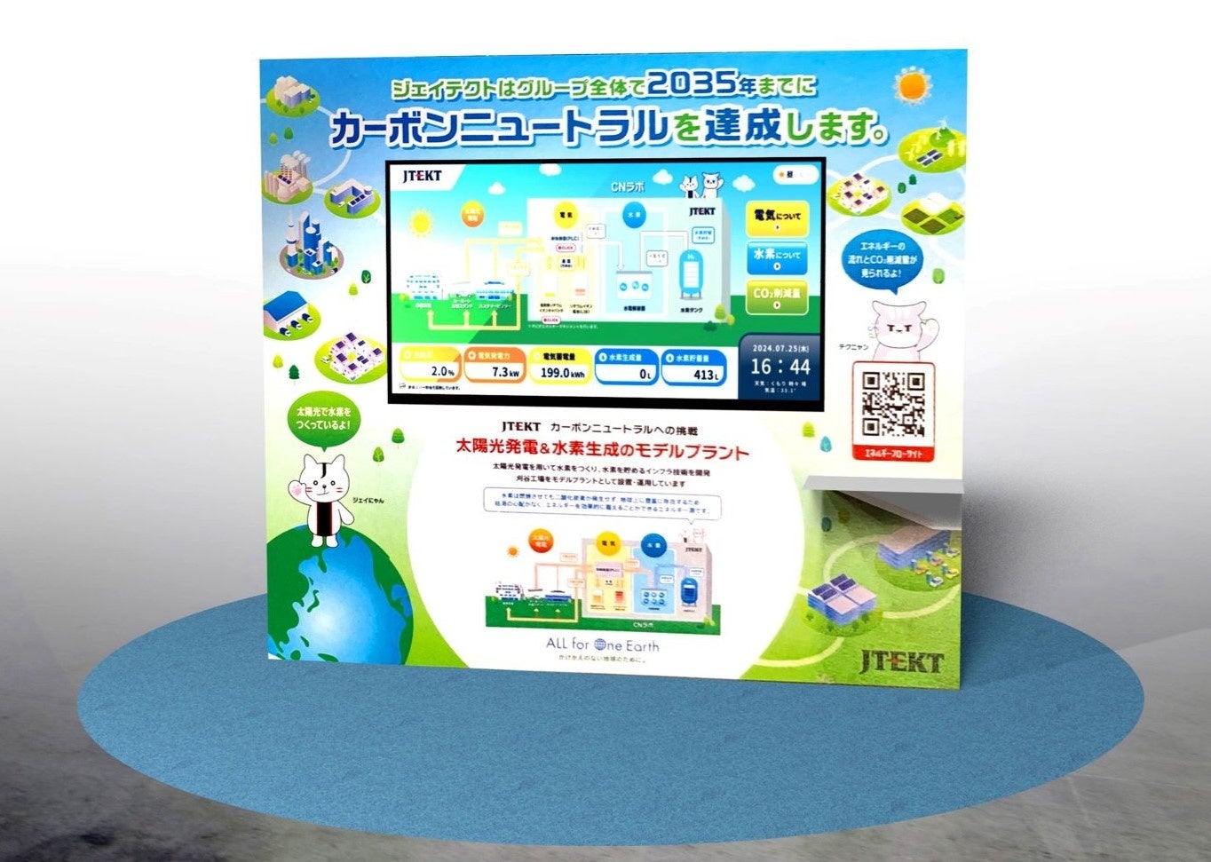 ジェイテクトは、太陽光発電を用いて水素をつくり、水素を貯めるインフラ技術である「CNラボ」を刈谷工場に設置しました。本展示会では、CNラボでの蓄電量や水素貯蓄量など、リアルタイムの稼働状況をご覧いただけます。