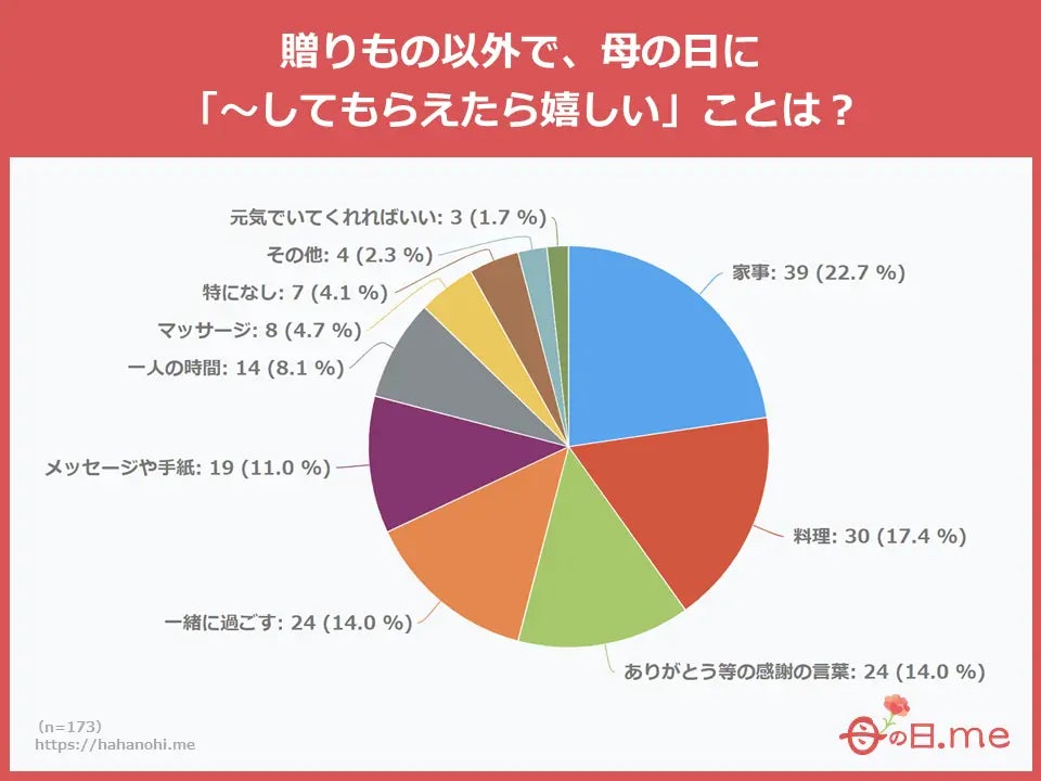 母の日.meが2024年に公開した、『【2024年度 母の日後】プレゼントを贈った方・もらった方へのアンケート調査』では、お母さんが母の日に「~してもらえたら嬉しい」ことは、家事22.7%、料理17.4%、ありがとう等の感謝の言葉14.0%、一緒に過ごす14.0%という結果が出ています。