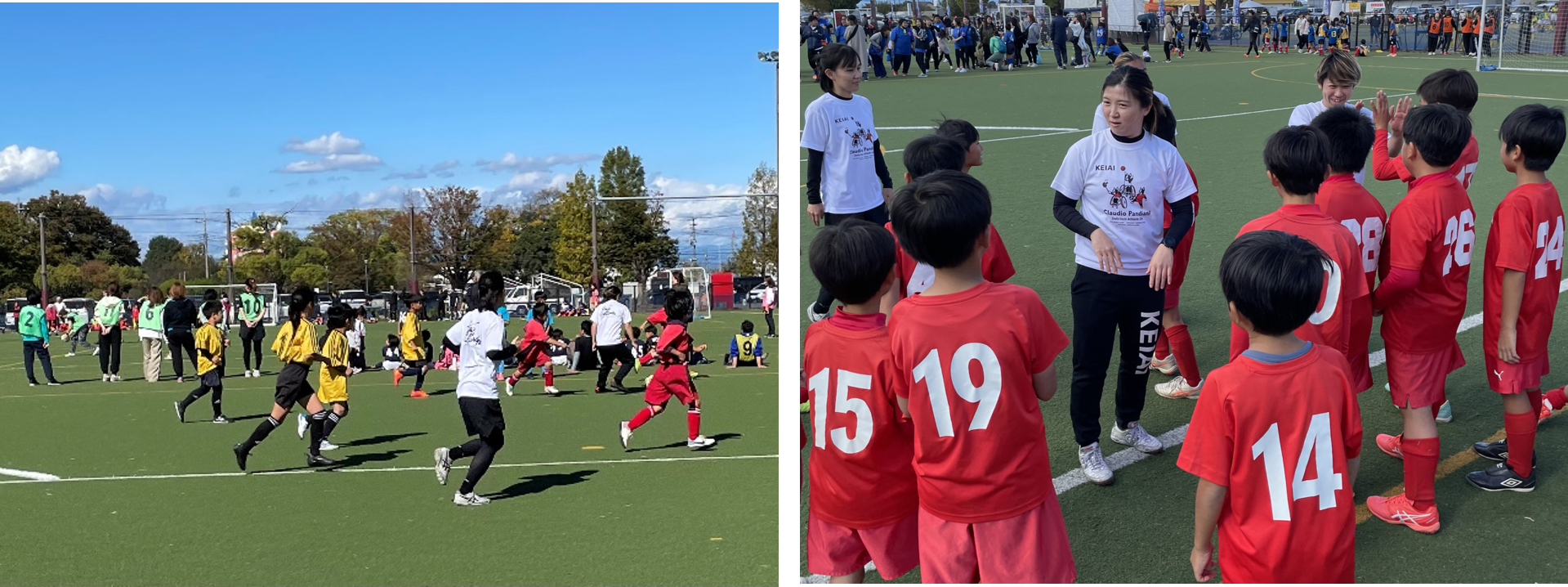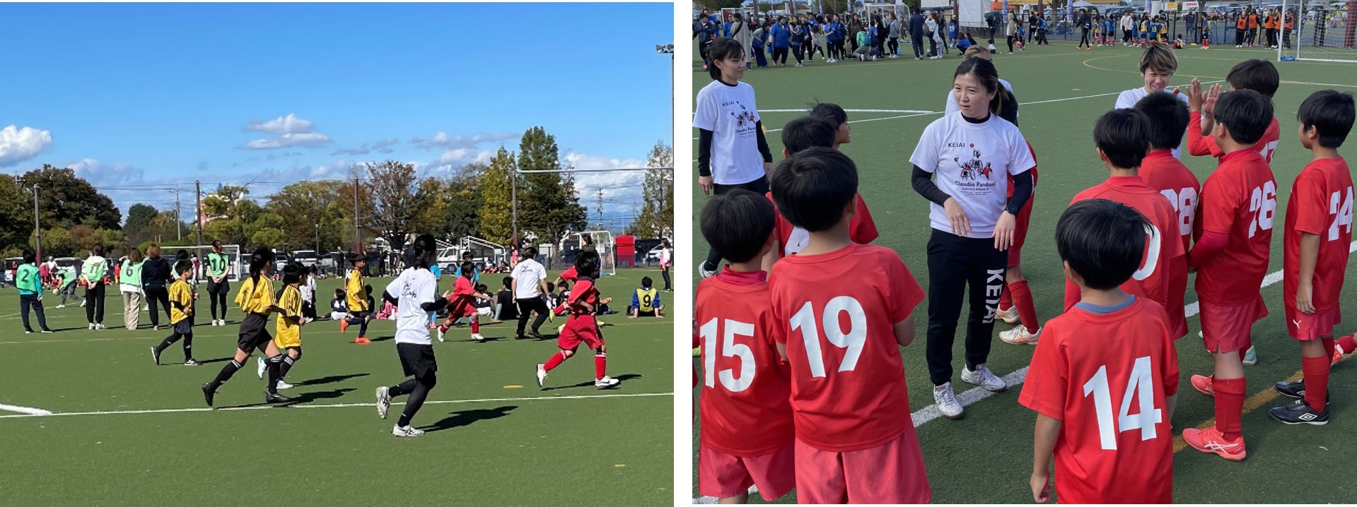 当日は、希望するチームの子どもたちと各選手が混ざって交流試合を行いました。最後に全部門の大会最優秀選手が選出され、ケイアイチャレンジドアスリートチームとエキシビジョンマッチを行い、当社のオリジナルプラクティスシャツを贈呈しました。