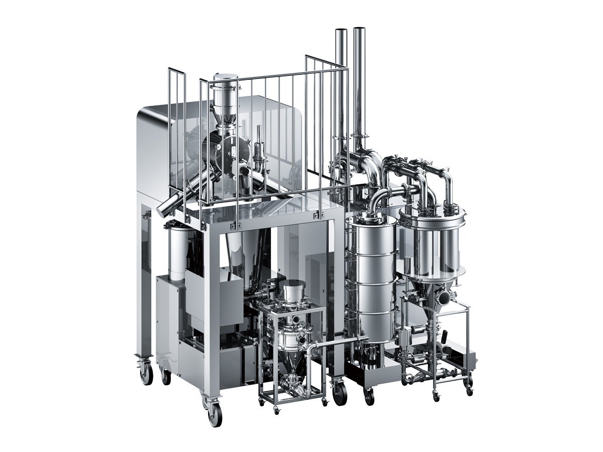 粉体機械事業ブースは原料加工ゾーンに出展し、連続造粒装置DOME-EXシステムや混合機とNIRを用いた混合度リアルタイム計測システムなどを展示します。DOME-EXシステムは精密混合、混練、造粒、乾燥の各バッチ処理工程をワンステップで処理する装置です。優れた含量均一性、品質を長時間持続し、連続生産に最適なPATツール、打錠前に必要な滑沢混合機も用意しています。