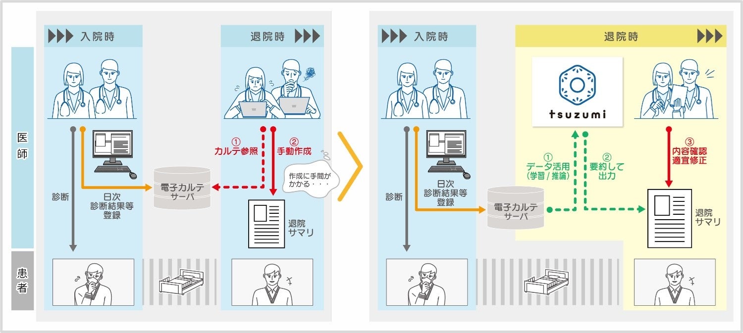 本実証では、医師の事務作業の1つである、患者の入院期間中の診療経過をまとめた「退院サマリ」(年間約1.5万件作成)の作成過程において、「tsuzumi」が生成した電子カルテの要約文章を活用することで、作成業務が効率化できるかを検証します。電子カルテデータを基に医師自らが文章を作成するのではなく、「tsuzumi」が生成した文章を医師が確認・修正することで、作成に要する時間を短縮しつつ、最終的なアウトプットの質を落とさない業務フローの実現をめざします。