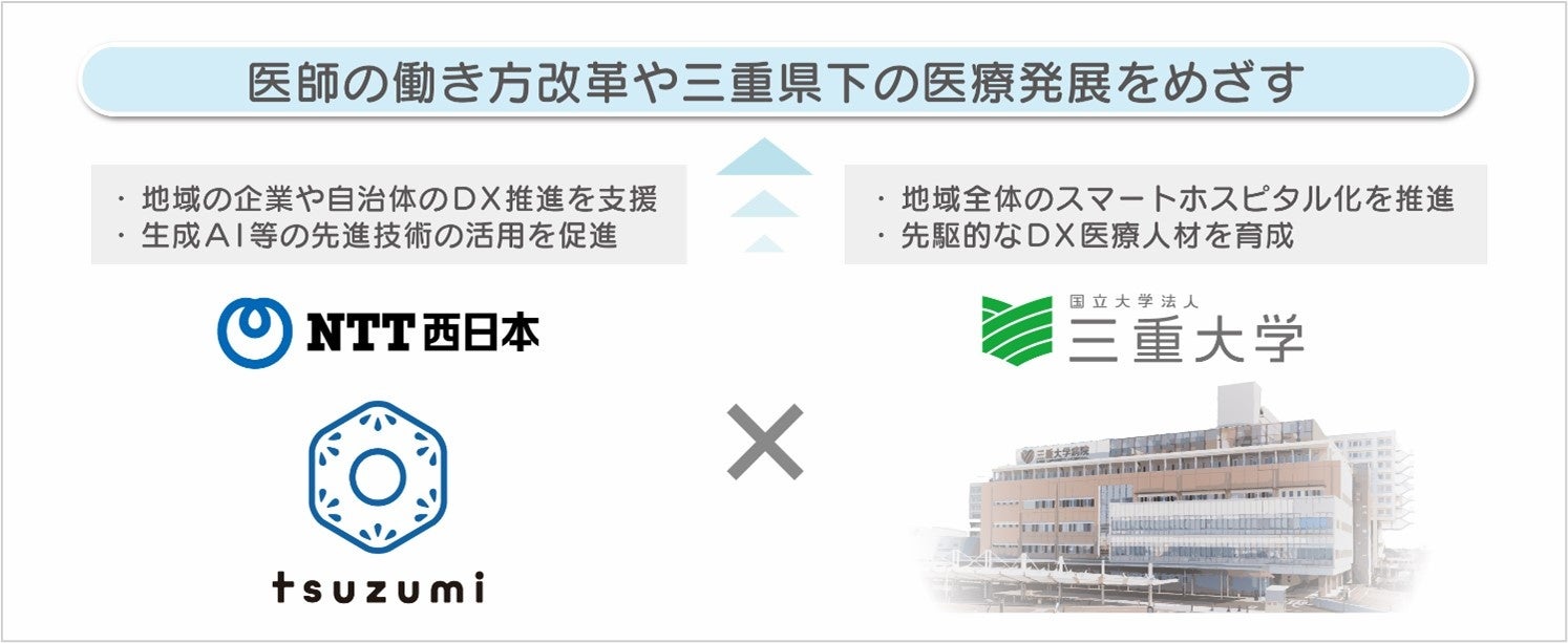 「tsuzumi」の提供および技術検証や、生成AI等を活用したDX推進支援を実施するNTT西日本と、三重県内唯一の大学病院として、先駆的なDX医療人材の育成と地域全体のスマートホスピタル化を通じた県域の医療課題解決をめざす三重大病院が連携し、三重大病院での業務における「tsuzumi」の実用性と適用可能性の評価を実施します。