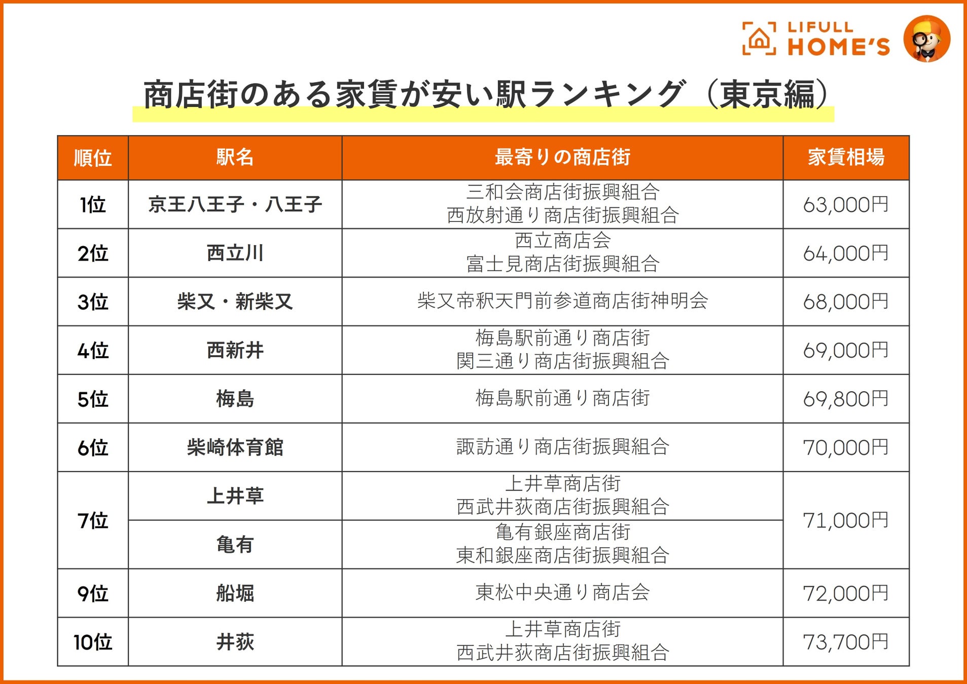 そこで、LIFULL HOME'Sでは、総合ナビゲーションサービス「NAVITIME」の「東京都の商店街」( https://www.navitime.co.jp/category/0205006/13/ )*¹にある、各商店街の最寄り駅*²を、家賃相場が安い順に並び替えたランキングを作成しました。本ランキングが住まい探しのアイデアのひとつとして参考になれば幸いです。