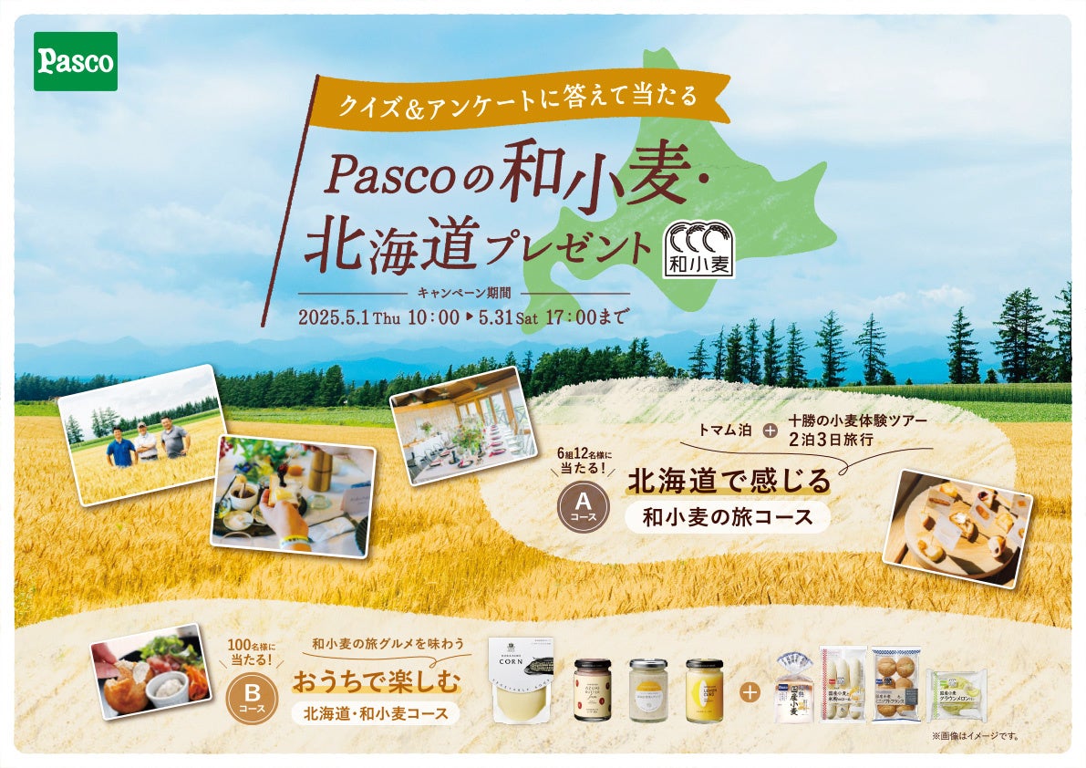 敷島製パン株式会社(Pasco)は「Pascoの和小麦・北海道プレゼント」キャンペーンを、2025年5月1日(木)~5月31日(土)の31日間実施します。今年は2泊3日の北海道ツアーだけでなく、おうちで楽しめるコースもご用意!専用サイトから、クイズとアンケートに答えてご応募ください。