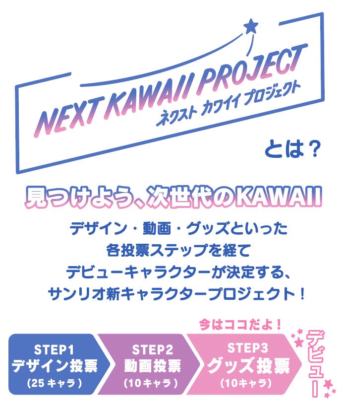 株式会社サンリオ(本社:東京都品川区 代表取締役社長:辻󠄀 朋邦、以下サンリオ)は、2022年6月10日(金)より開催中の、サンリオの次にデビューする新キャラクターを決めるユーザー参加型プロジェクト「NEXT KAWAII PROJECT(ネクストカワイイプロジェクト)」の最終審査「STEP3:グッズ投票」を2023年1月13日(金)より開始いたします。デビューをかけた最終審査「STEP3:グッズ投票」では、勝ち残った10キャラクターのグッズを発売し、その購入数によってポイントが加算されます。1月12日(木)に順位を発表予定の「STEP2:動画投票」の結果によって各キャラクターへポイントが割り振られた状態からスタートし、「STEP3:グッズ投票」での獲得ポイントと合算した結果、最終1位となったキャラクターはサンリオの新キャラクターとして本格的にデビューいたします。最終結果は、3月上旬にサンリオ公式YouTubeにて発表予定です。