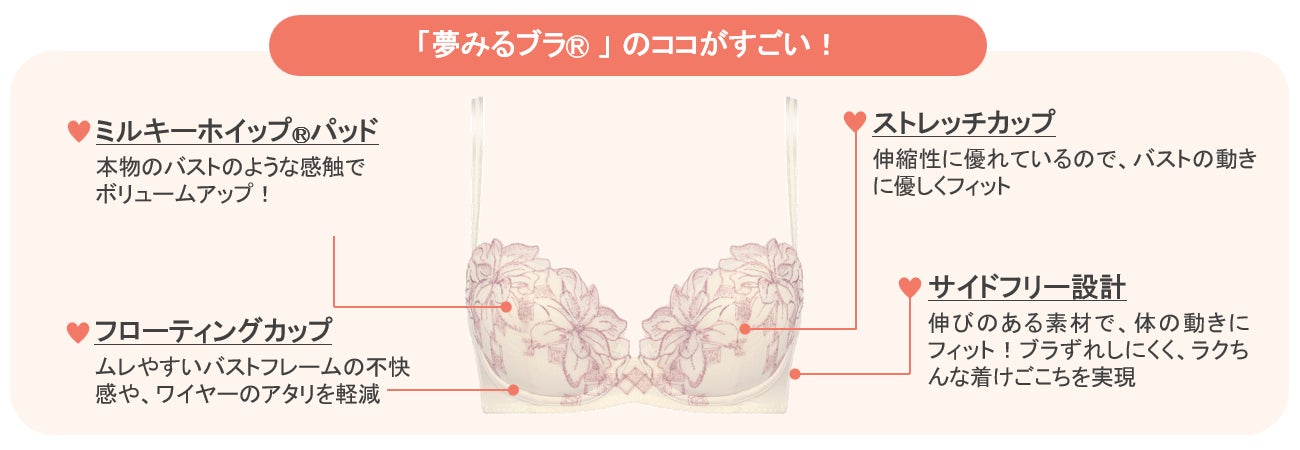 一度着けたらとりこの大人気フィット!取り外し可能なミルキーホイップⓇパッドで、本物のバストのような感触でボリュームアップ!サイドパネルには伸びのある素材を使用しているので、体の動きにフィット。またストレッチ性の高いカップはフローティング仕様のため、ワイヤーの食い込みを軽減し、ブラずれしにくく、ラクちんな着けごこちです。