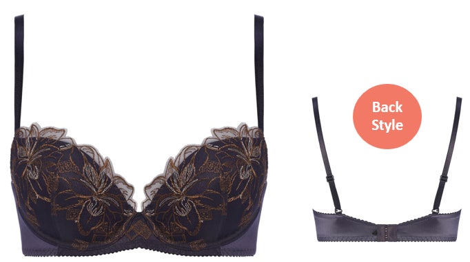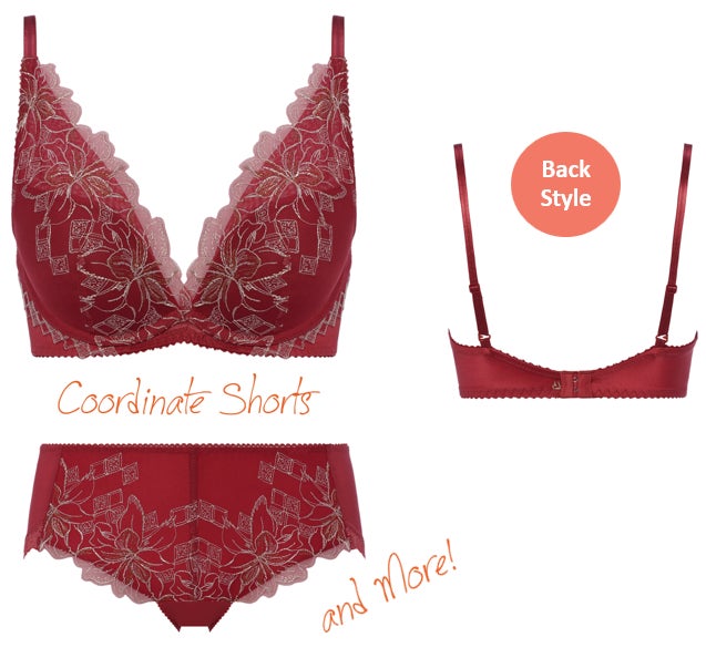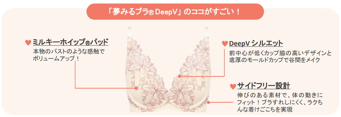 取り外し可能なミルキーホイップパッドⓇで、本物のバストのような感触でボリュームアップ!胸もとはシャープなV字のデコルテラインですっきりとした印象に。底厚のモールドカップでバストを前中心に集めてきれいな谷間をメイクしますが、サイドには伸びのある素材を使用しているので、ブラずれしにくく、ラクちん。カップのサイドは高さがあるので、安定感のある着けごこちです。
