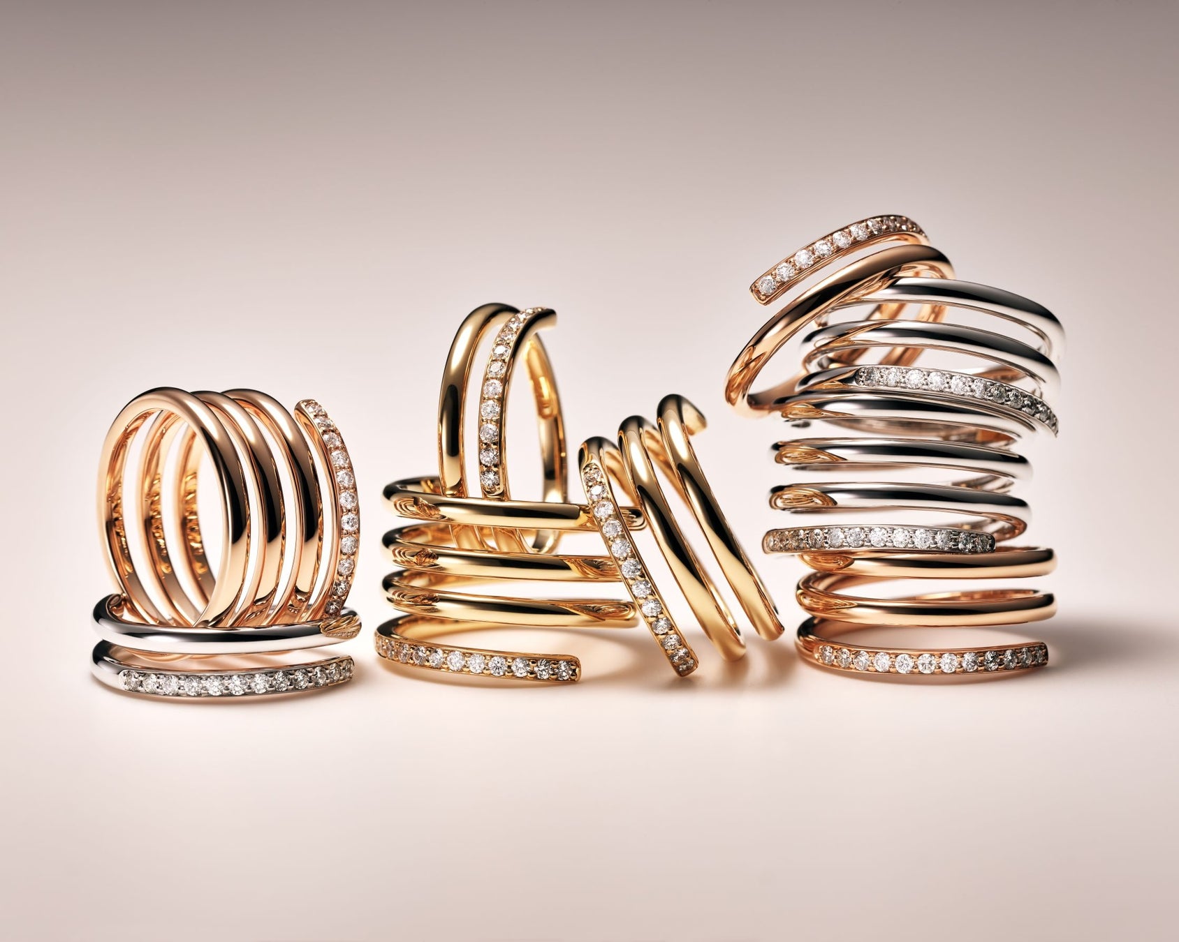 螺旋に繊細なパヴェダイヤモンドをイレギュラーに配したバランスが、センシュアルな指先を演出する。