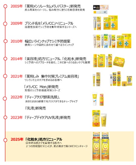 メラノCCは2005年に「薬用メンソレータムメラノバスター」美容液として誕生しました。「ビタミンC」の力に着目し、ニキビやしみ、毛穴、肌荒れなど様々な肌悩みに寄り添いながら、時代とともに進化を続け、多くのお客様にご支持いただいております。2022年には、「ディープクリア酵素洗顔」が発売から10ヵ月で20億円を突破し大ヒットを記録。また化粧水市場においては、「薬用しみ対策 美白化粧水」が2年連続、売上個数No.1※1を獲得するなど、ブランドとして着実な成長を続けてまいりました。20周年を迎えるにあたり、ともに歩んでくださったお客様への感謝と、より良い製品をお届けしていく決意を新たに、肌悩みのない、調子の良い状態が毎日続く、「毎日晴れやか」な肌を目指して、「メラノCC」は進化し続けます。