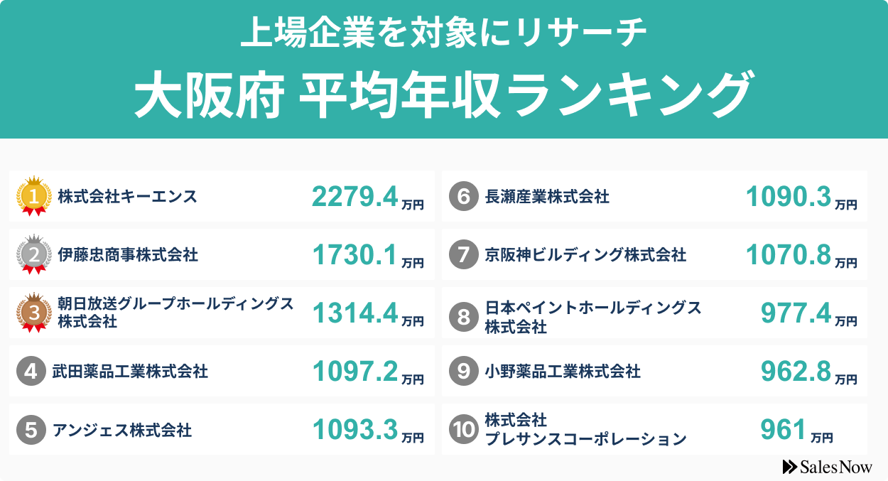 【大阪府】上場企業平均年収ランキングTOP10!/SalesNow DBレポート