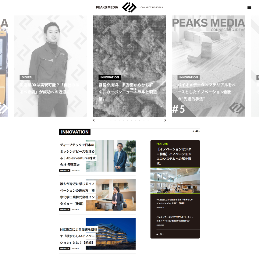 製造業を取り巻く環境は大きく変化し、自社だけでは解決できない複雑な課題が増え、産業や業界、従来の壁を越えたオープンイノベーションの重要性は増しています。松尾産業は商社の「つなぐ」力にスポットをあてた取り組みを加速させています。その一つとして、産業の垣根を越えて英知が集う場所「PEAKS MEDIA」を立ち上げました。