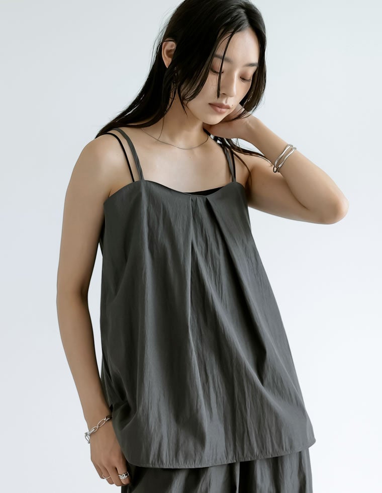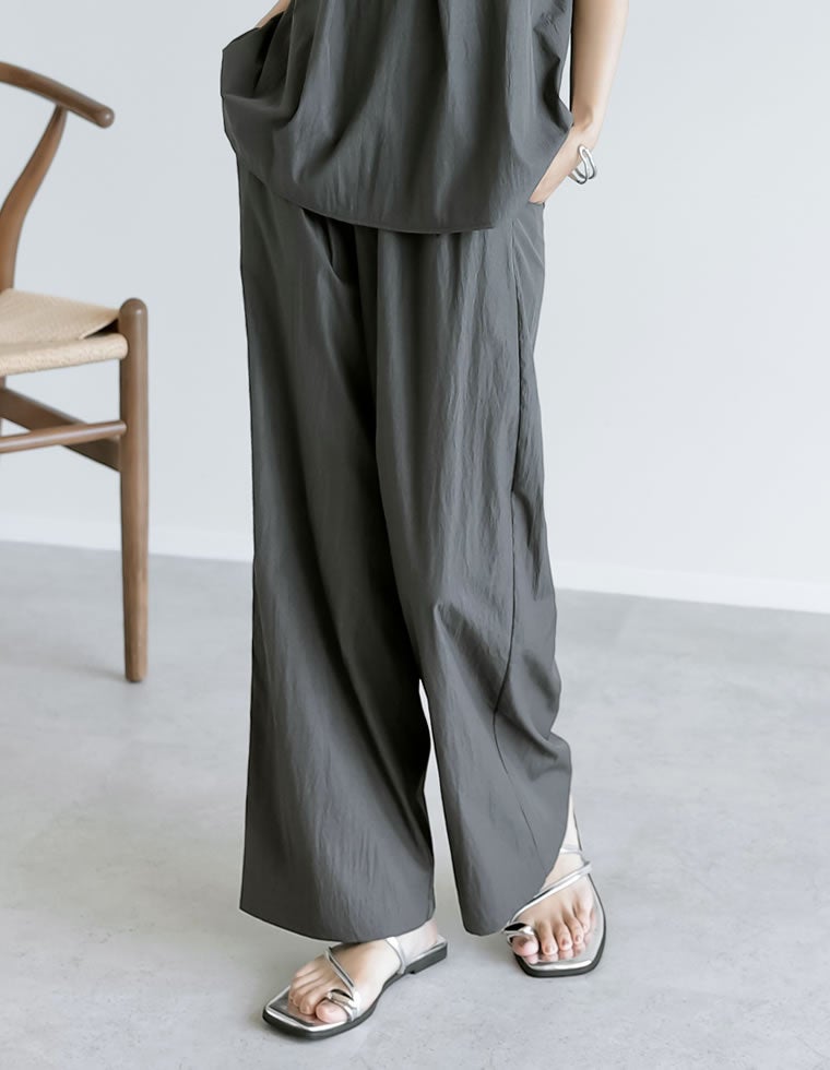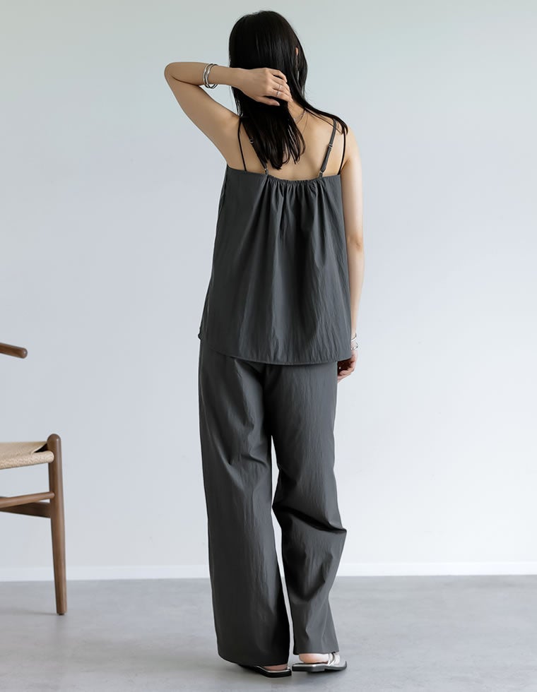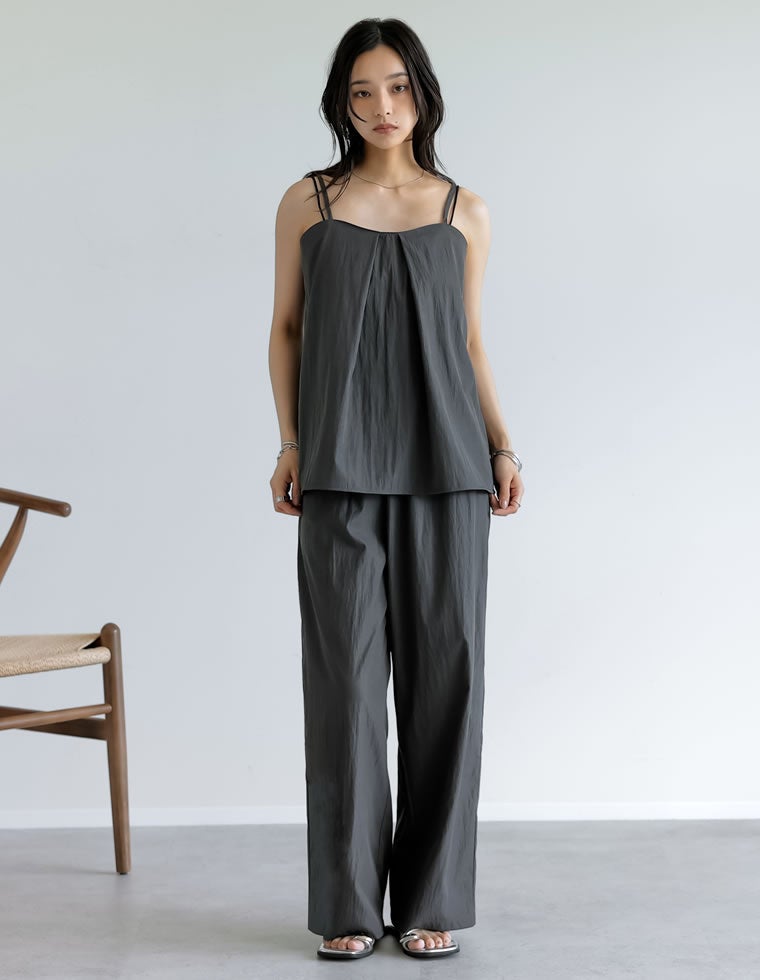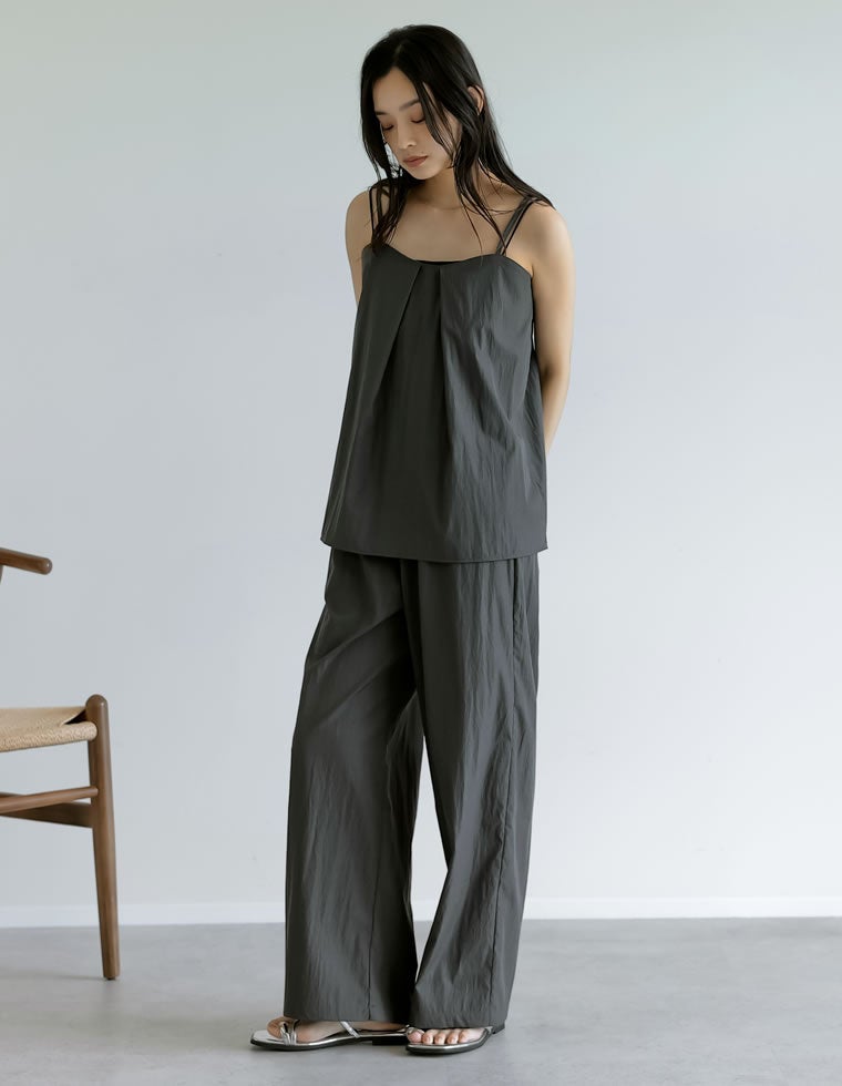 撥水機能を備えた軽やかなナイロン混素材で仕立てた、キャミソールトップスとワイドパンツの2点セット。