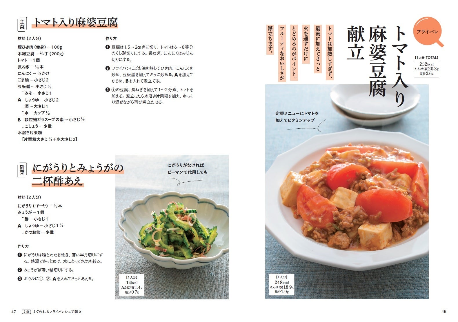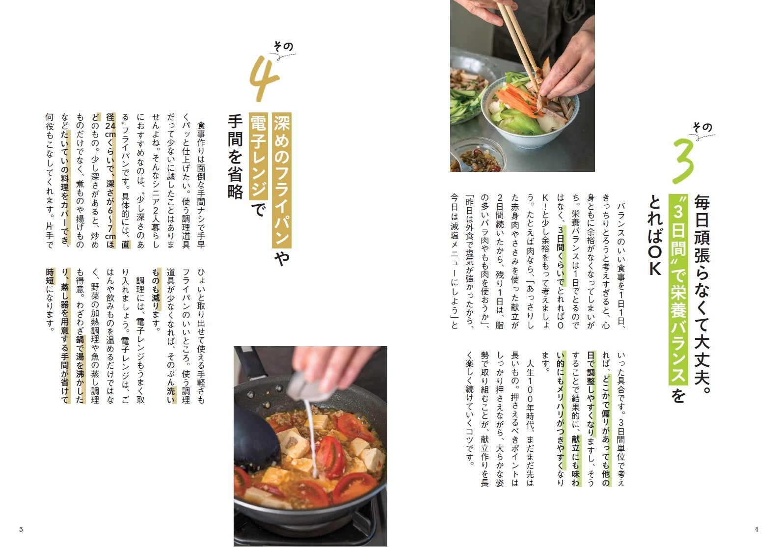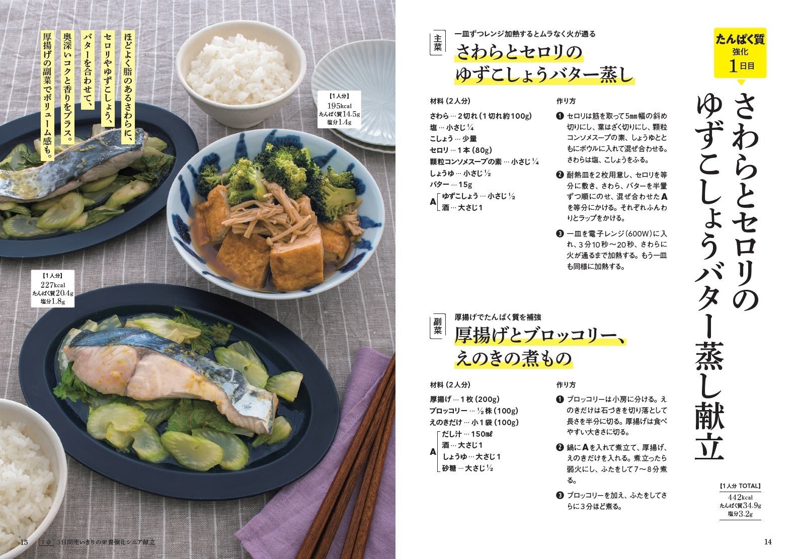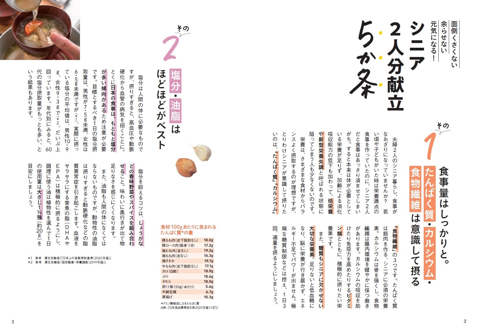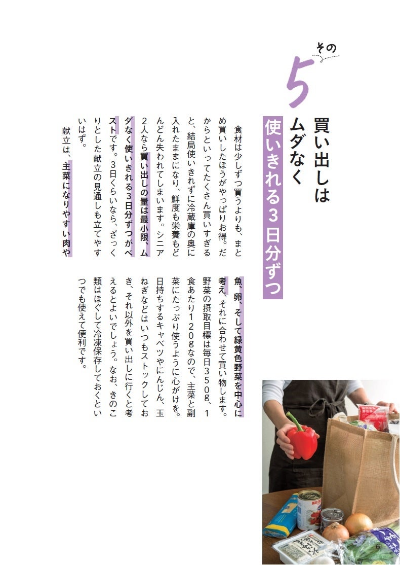『シニア暮らしにちょうどいい2人分献立』」は、たんぱく質、カルシウム、食物繊維などのシニアが摂りたい栄養素をしっかり含む献立レシピを紹介。食材を無駄なく使い切れる3日間献立のほか、フライパン1つでできる献立など手軽にできる献立レシピを掲載しています。