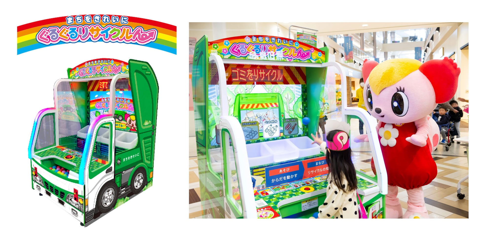「ぐるぐるリサイクルん」は、ごみ分別とリサイクルをテーマにし、子どもがゲームを楽しみながらリサイクル問題を学べる当社のオリジナルエデュテイメント機種です。